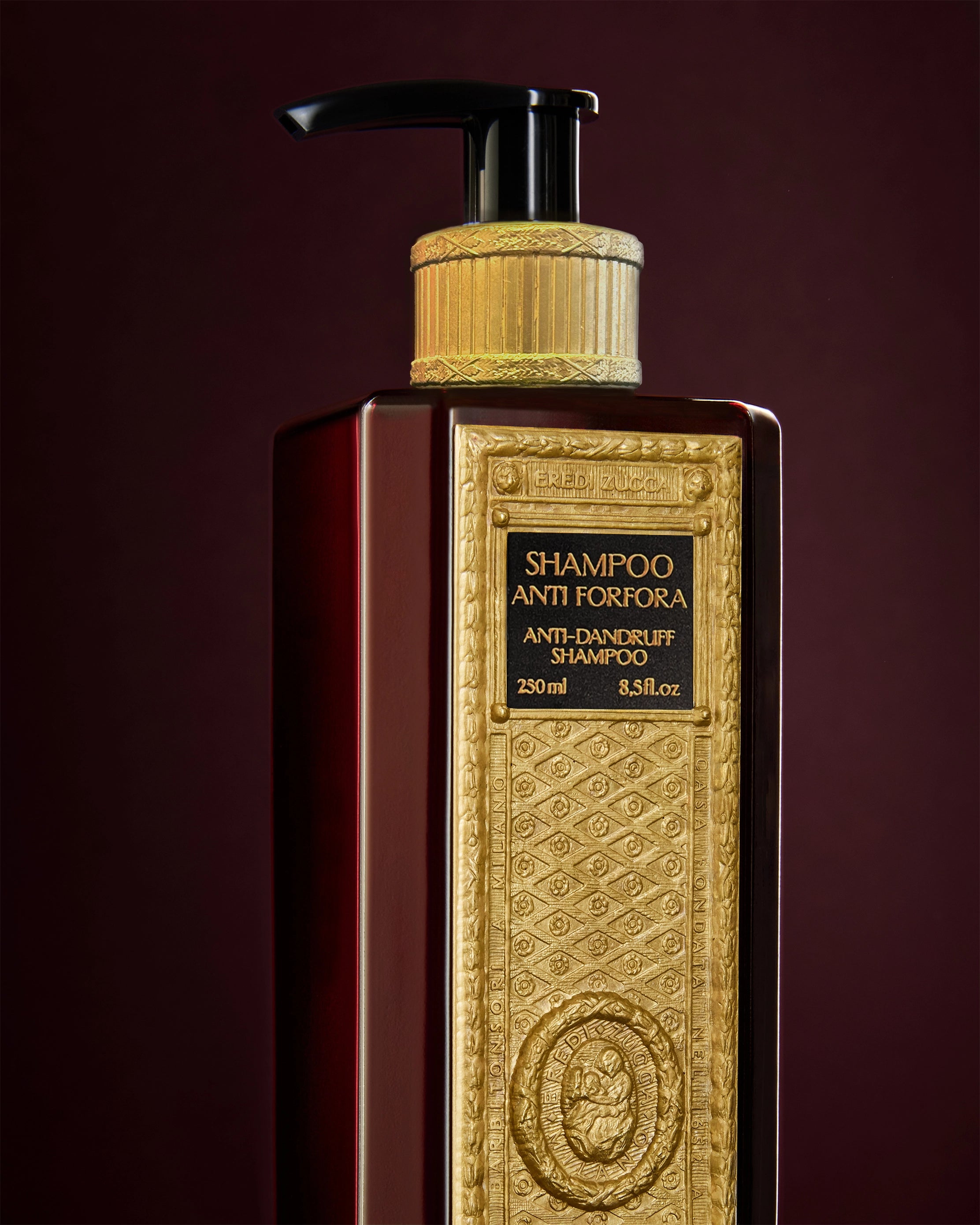 - Contained in a 250 ml burgundy PETG bottle, embellished with brass Eredi Zucca details