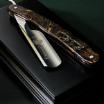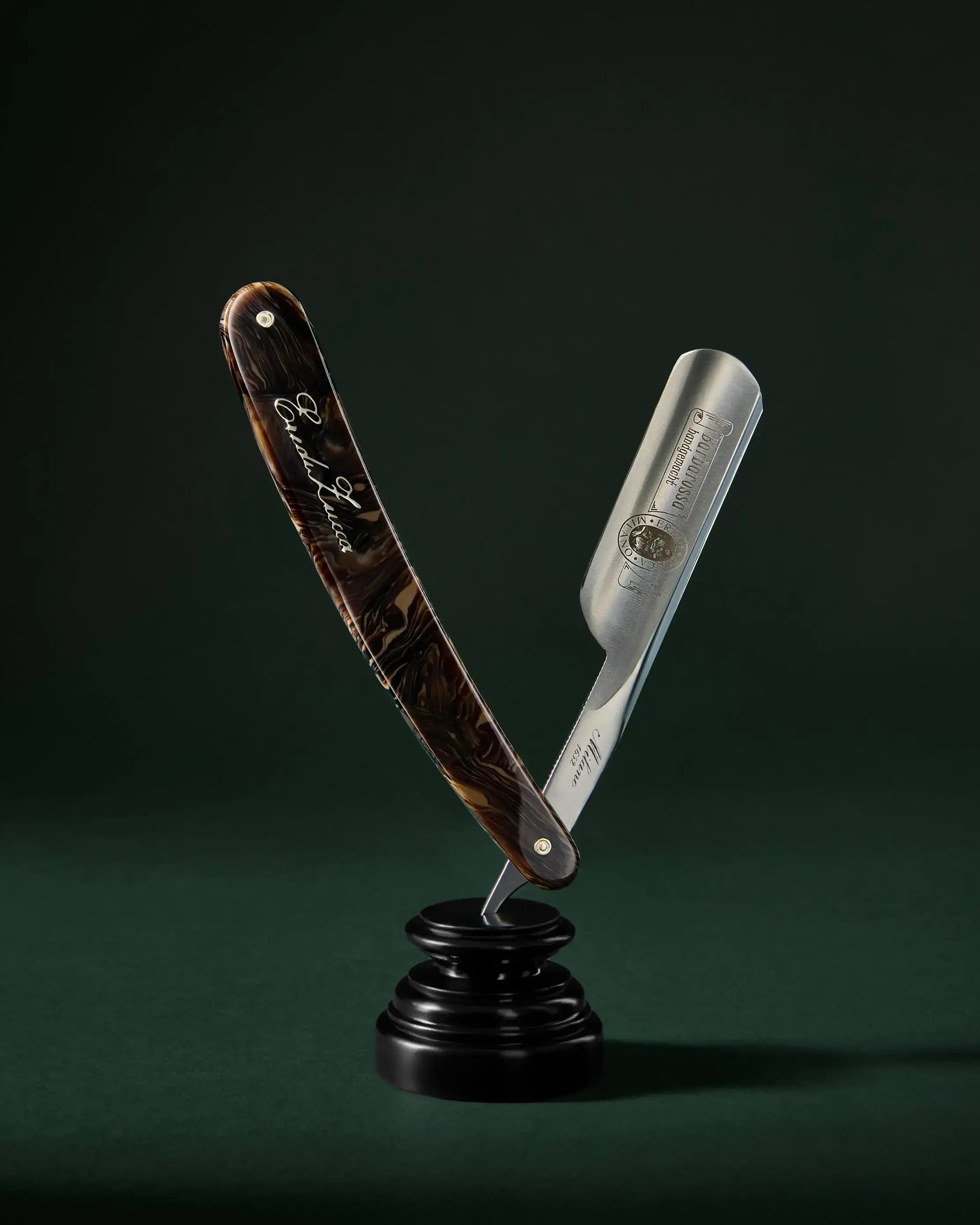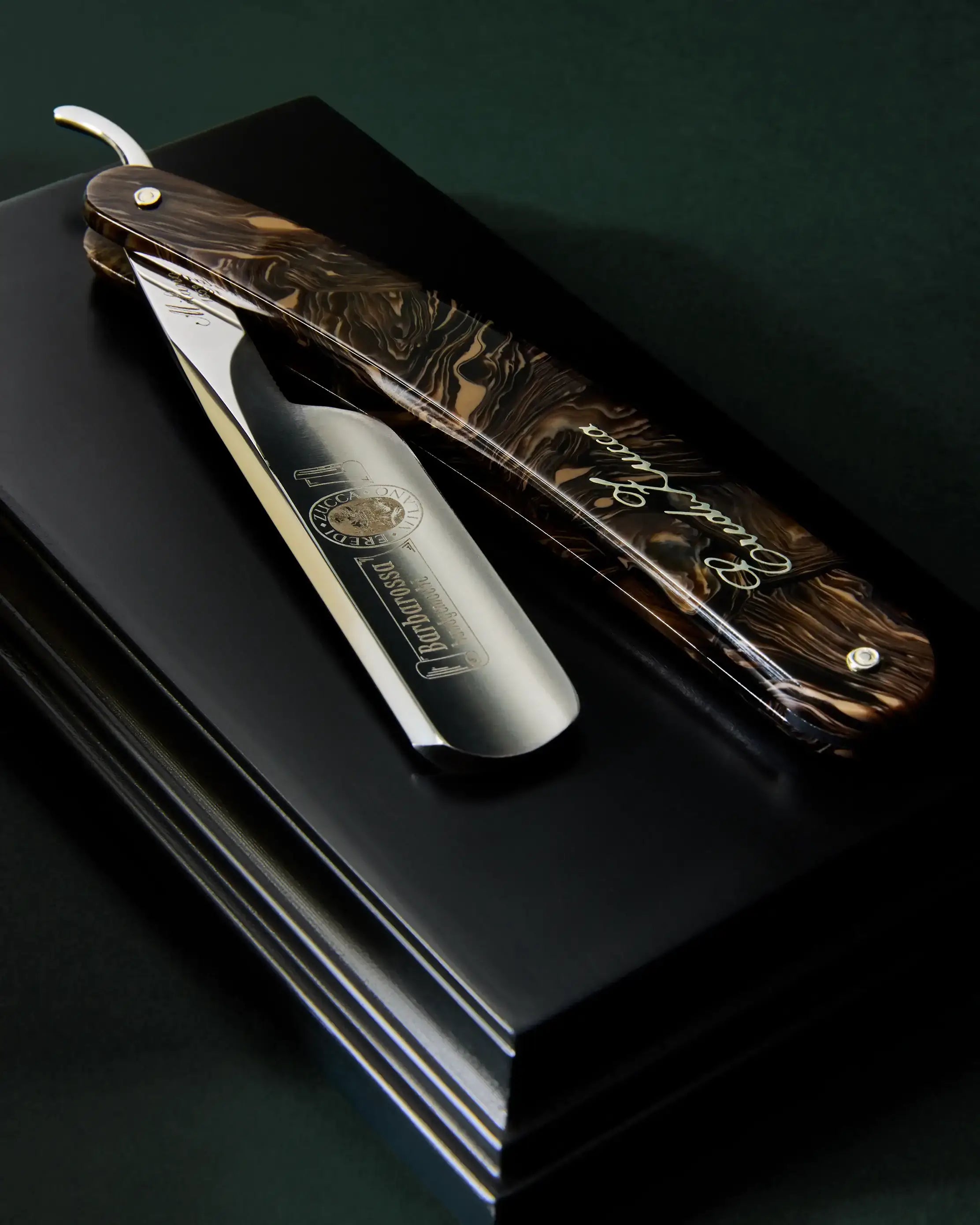 Straight razor with Chocolate Carrara acetate handle. Equipped with a 1.2210 carbon steel blade.
