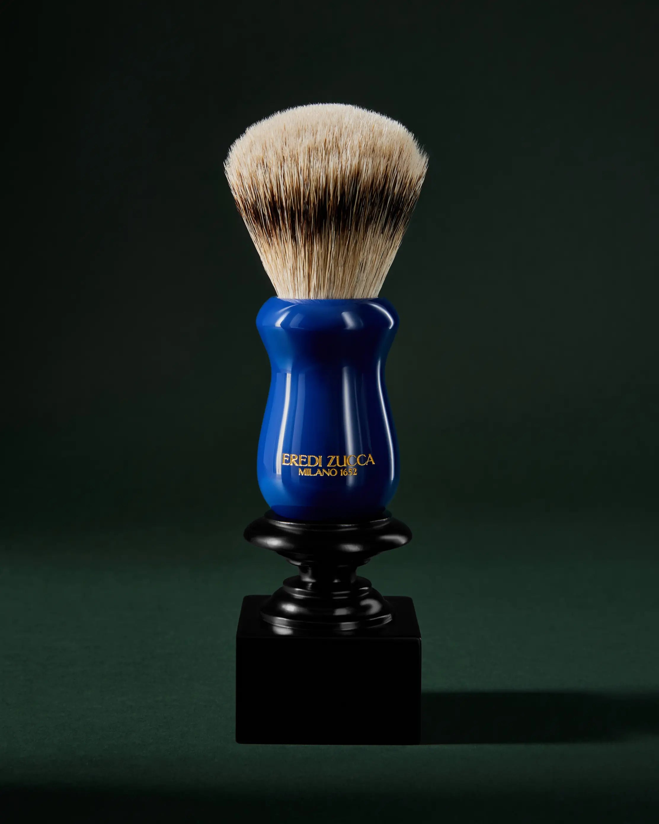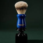 Blue resin shaving brush with badger bristles. For a controlled shaving experience with flawless results.