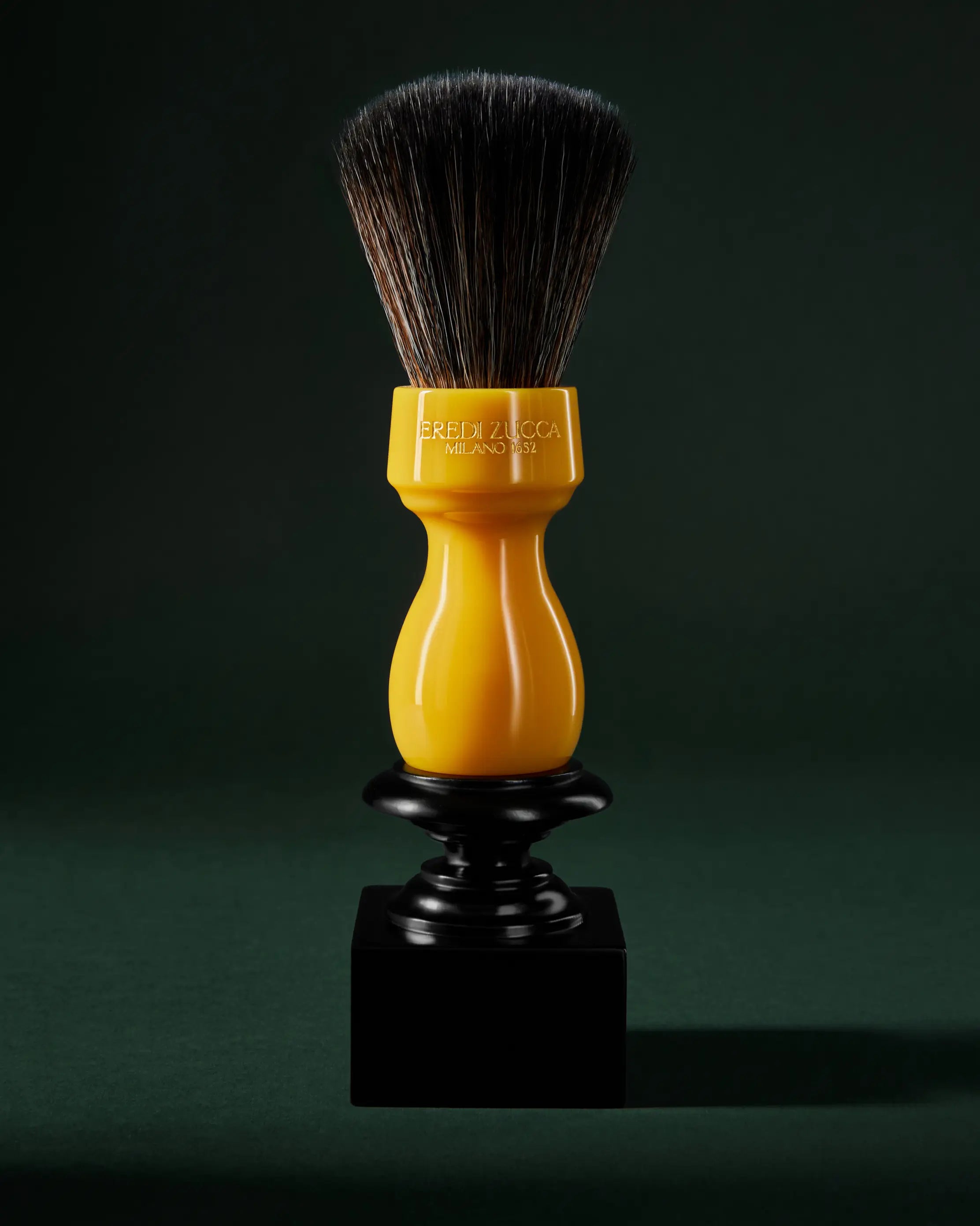 Butterscotch resin shaving brush with synthetic bristles. For a controlled shaving experience with flawless results.