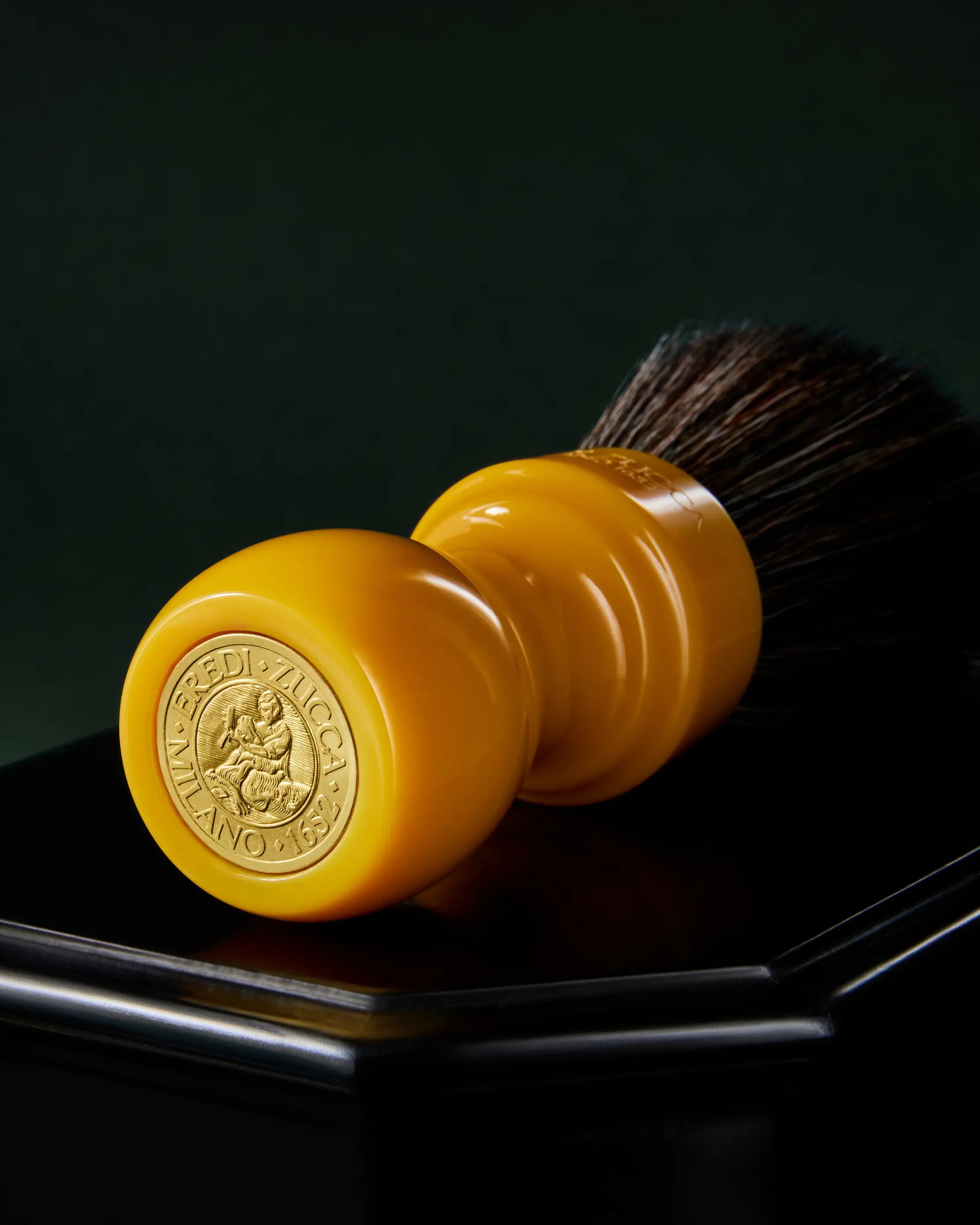 This accessory has been crafted with exceptional care for both materials and details, using the most prestigious of techniques that define the art of Italian craftsmanship. Hand-finished with a glossy butterscotch varnish, its resin handle is embellished with a brass Eredi Zucca medallion on the base. A harmonious silhouette and comfortable grip make this professional brush a high-precision, robust and effortlessly functional tool.