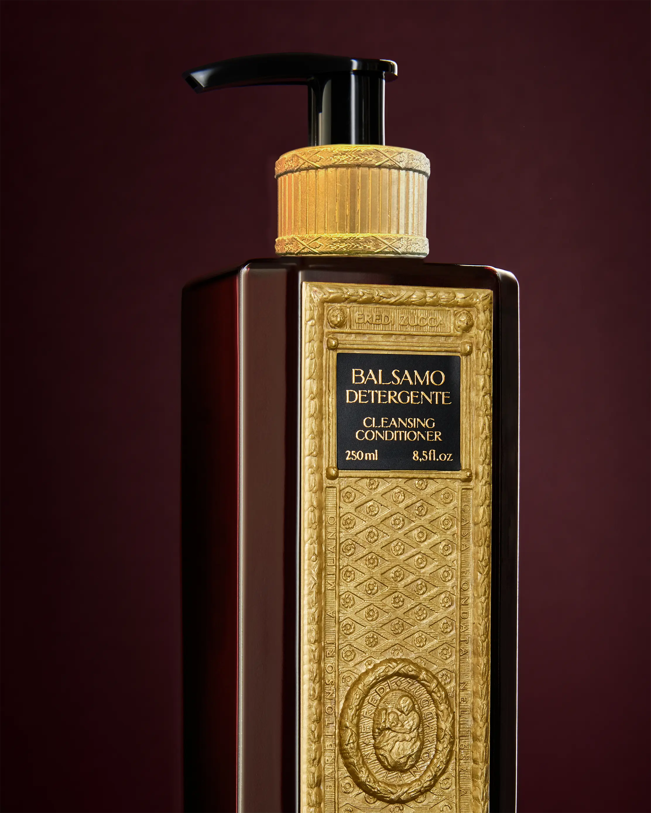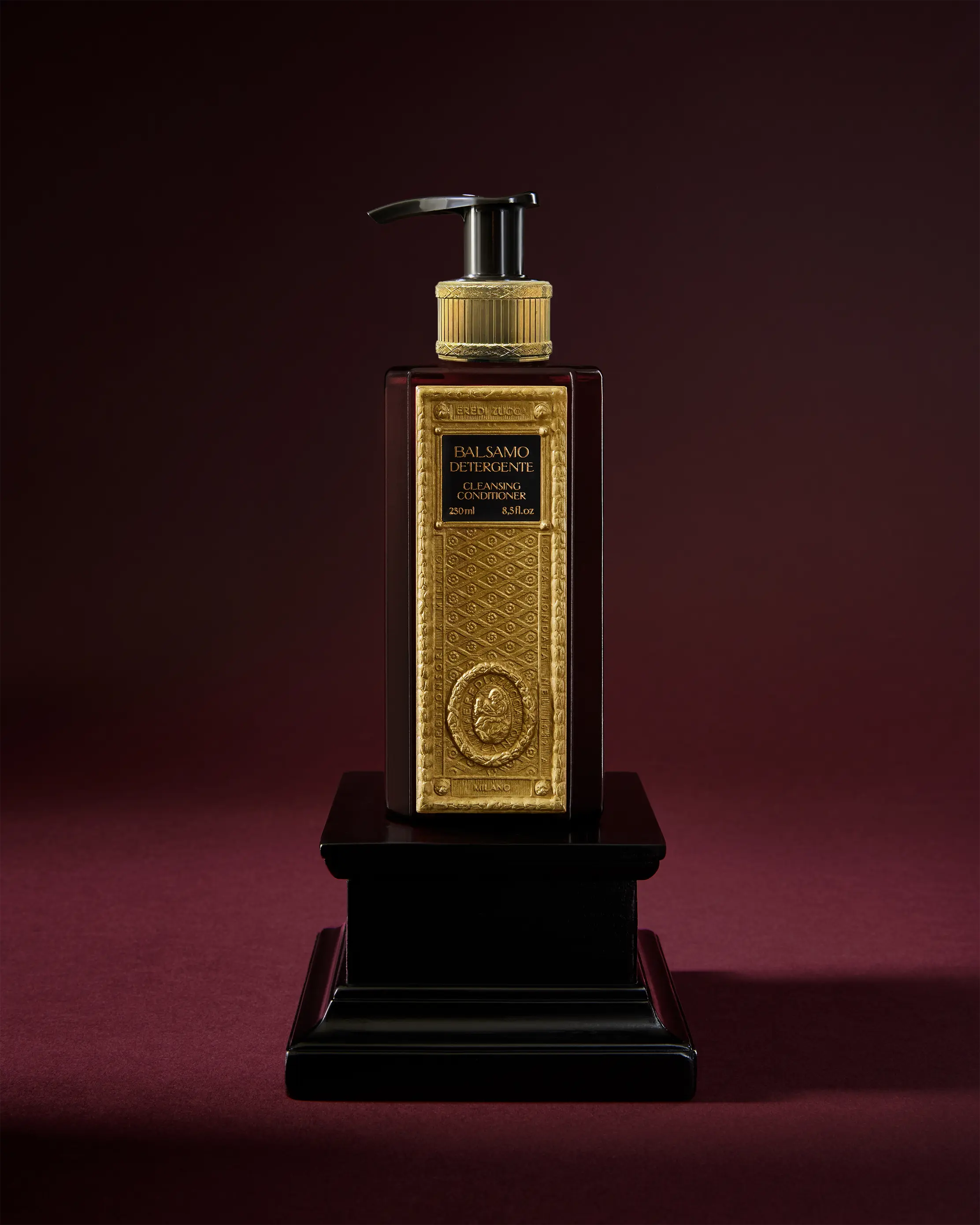- Contained in a 250 ml burgundy PETG bottle, embellished with brass Eredi Zucca details