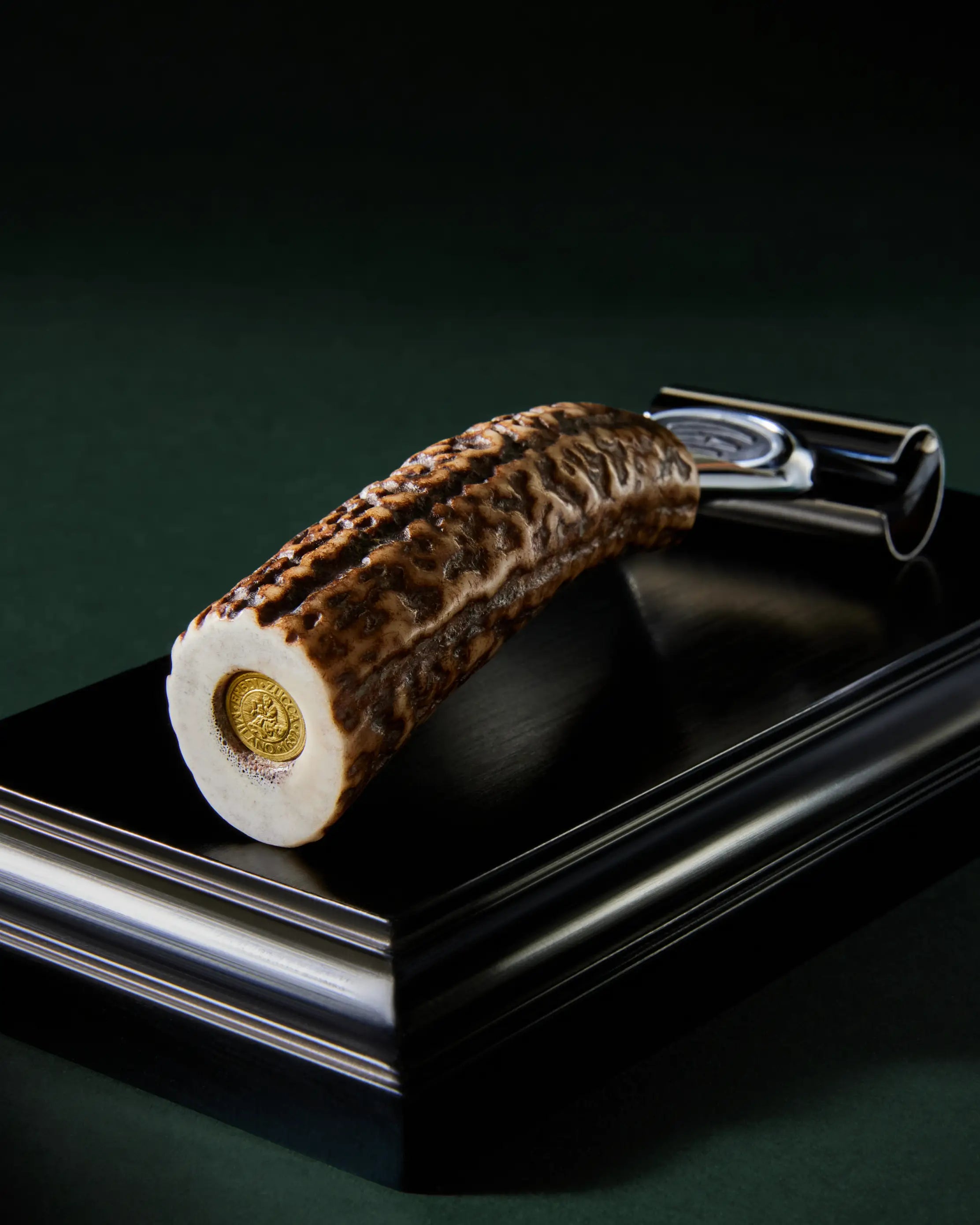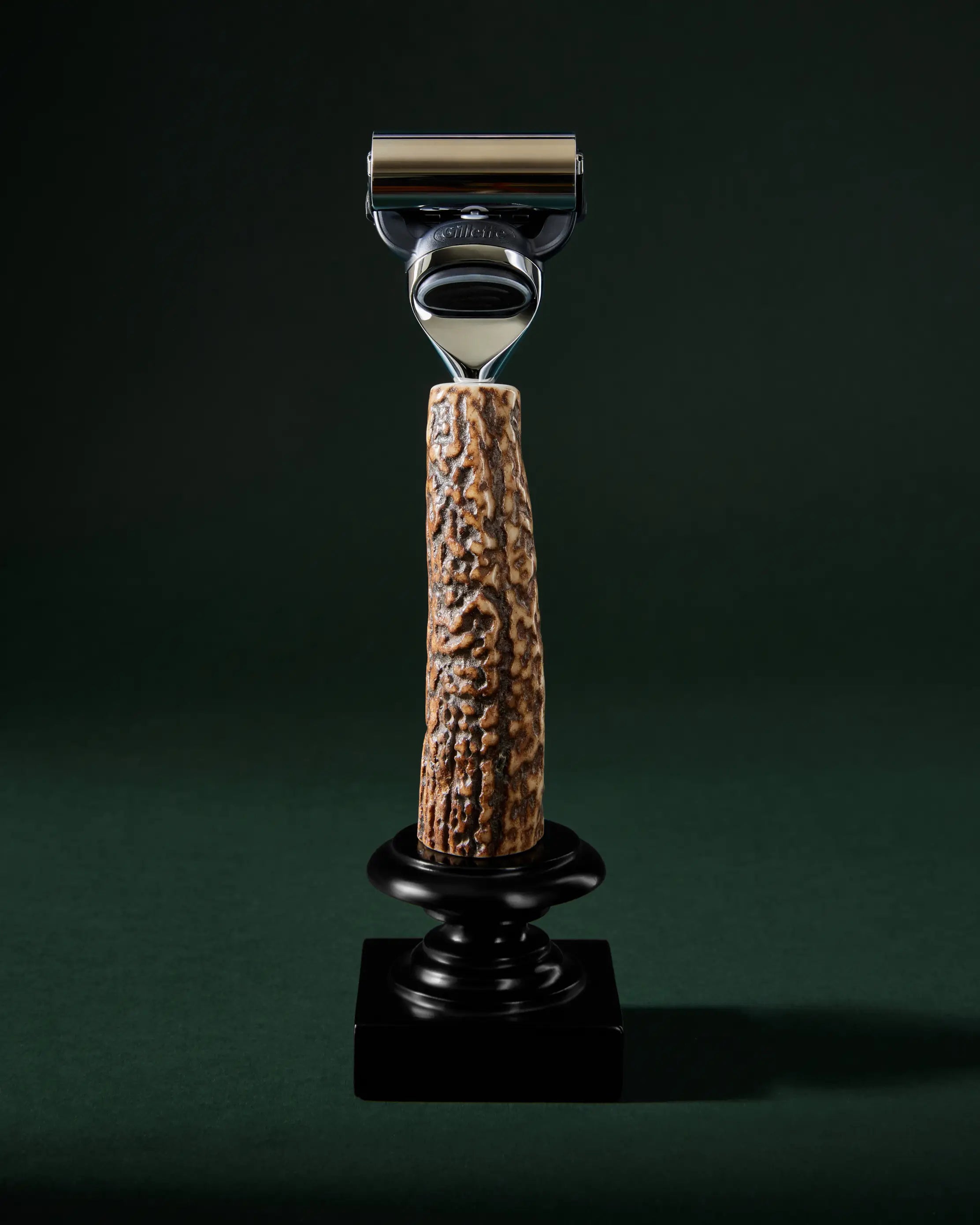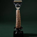 Razor with deer horn handle, hand-crafted in Italy. Designed with interchangeable fusion blades and head, and a brass Eredi Zucca medallion.