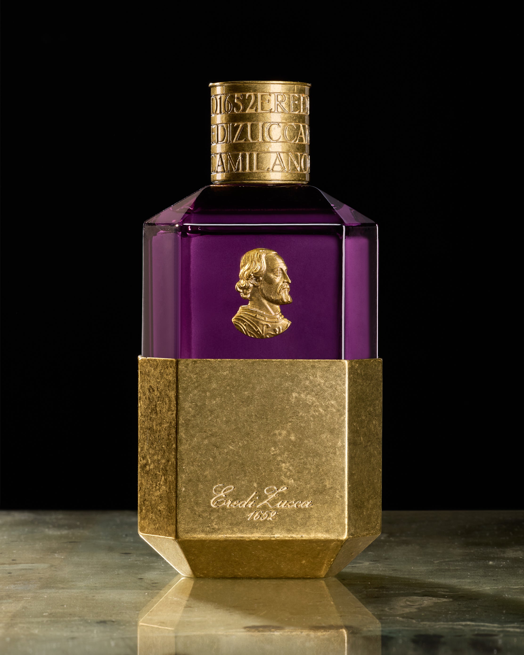 - Housed in a 100 ml diamond-faceted glass flacon recalling antique crystal perfume bottles, encased in brass-finished metal and crowned with a finely engraved cap