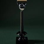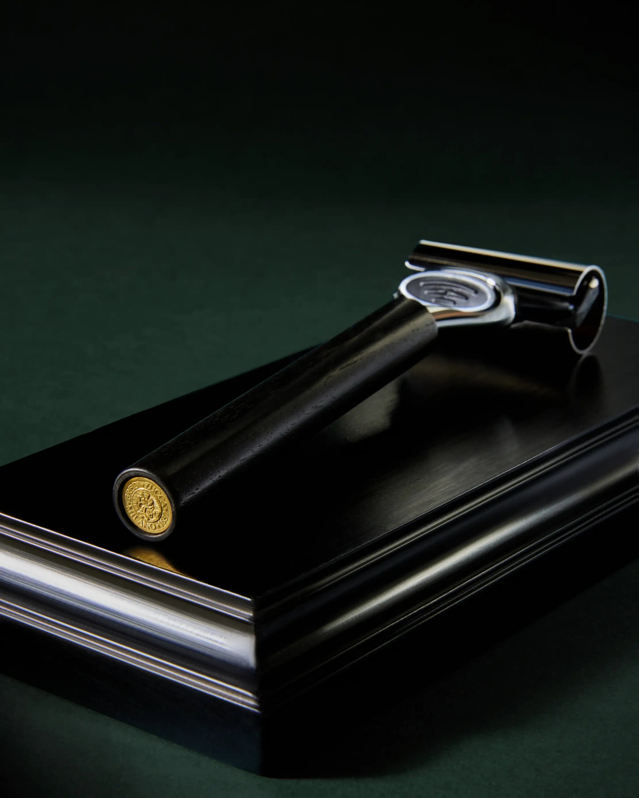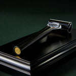 Razor with black ebony handle, hand-crafted in Italy. Designed with interchangeable fusion blades and head, and a brass Eredi Zucca medallion.
