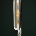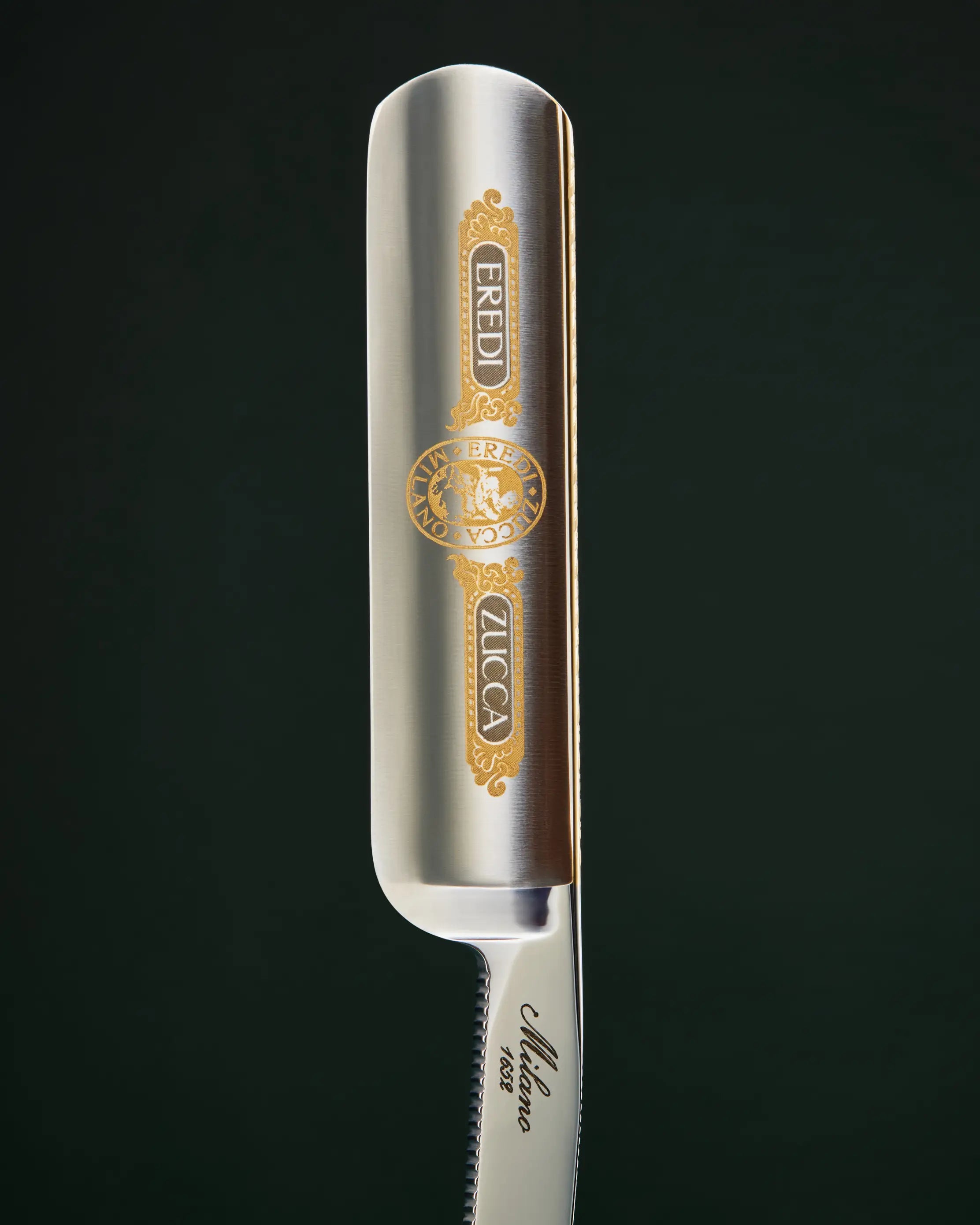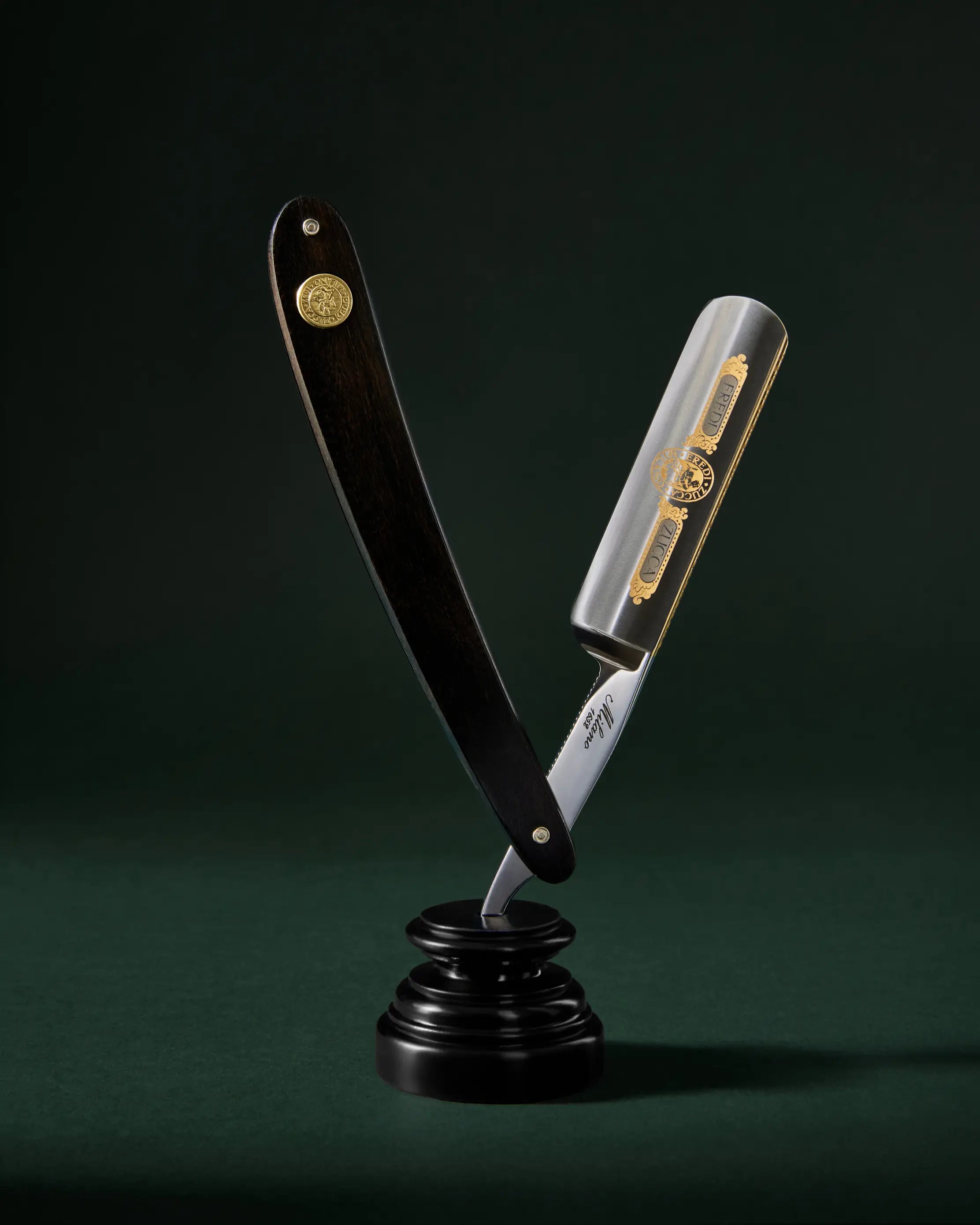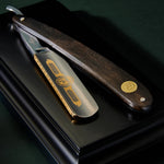 Straight razor with ebony handle, gold-plated 1.2210 carbon steel blade and brass Eredi Zucca medallion.