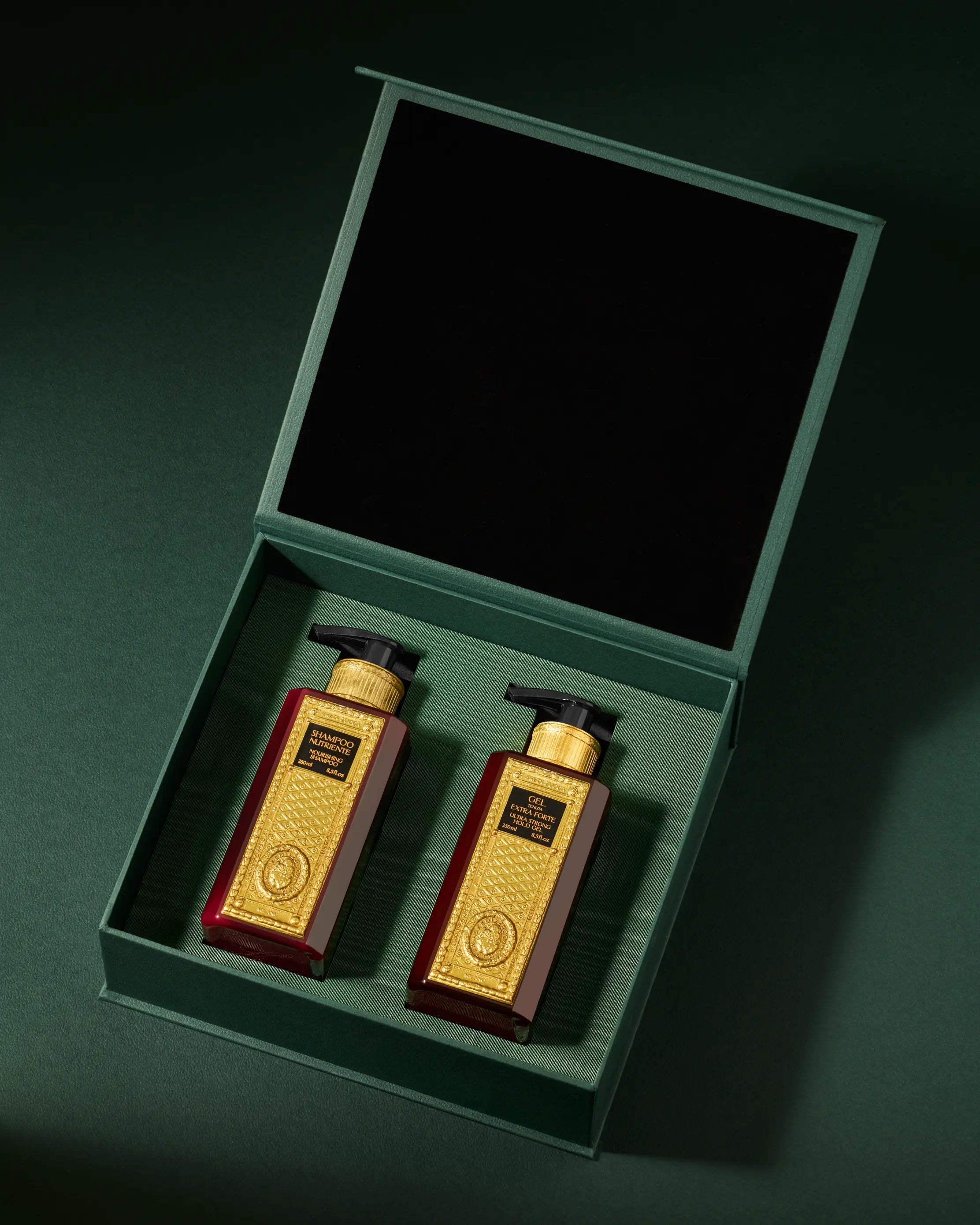Curated to awaken and energise both skin and hair, this set brings together a body wash and mint shampoo to refresh and revitalise your daily routine. The box in which they are presented perfectly embodies the stylistic DNA of Eredi Zucca, opening to reveal two bottles embellished with brass details in a balanced dialogue between artisanal tradition and modern sensitivity.