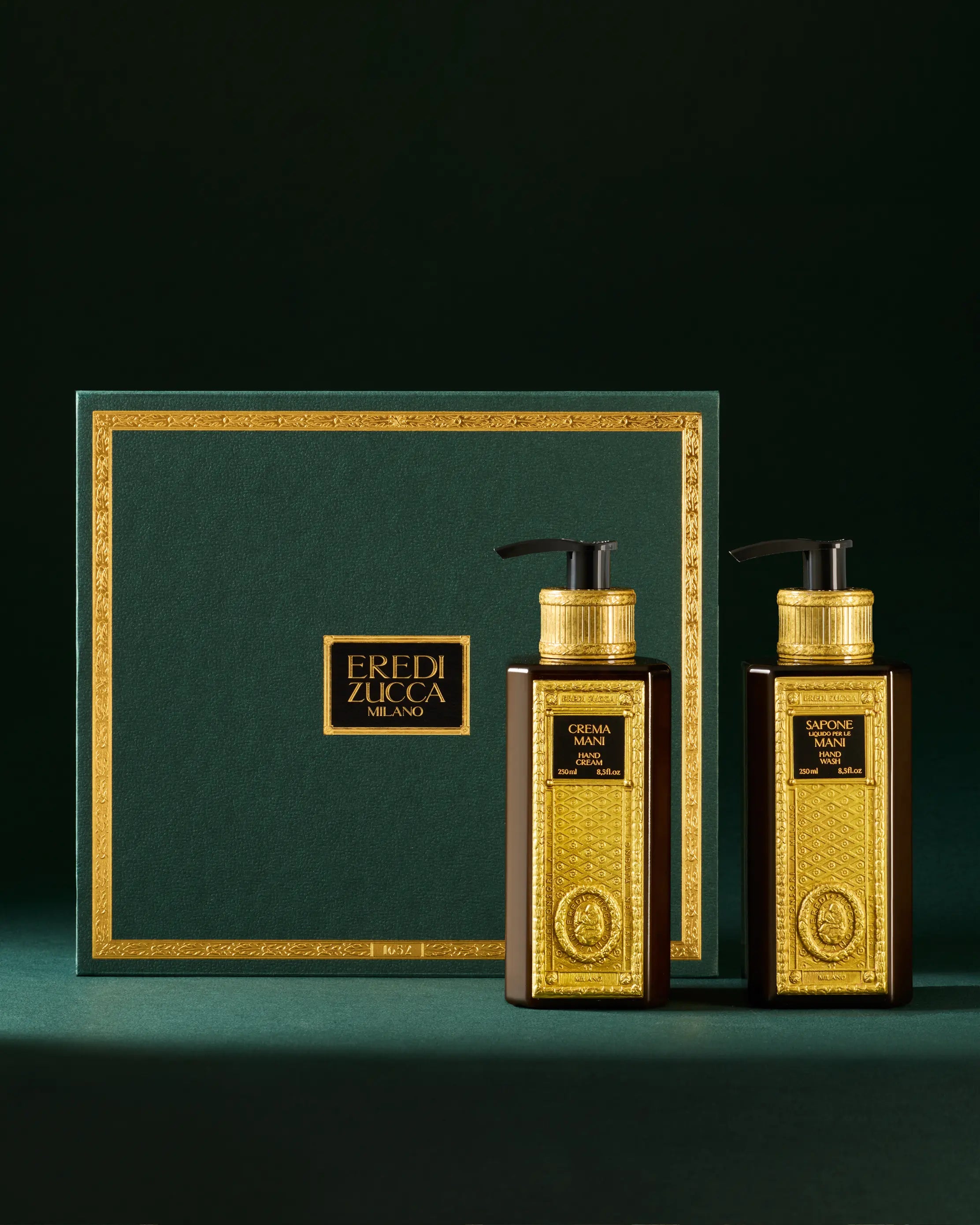 Liquid soap and hand cream become part of a single ritual that softens and protects. The box in which they are presented perfectly embodies the stylistic DNA of Eredi Zucca, opening to reveal two bottles embellished with brass details in a balanced dialogue between artisanal tradition and modern sensitivity.
