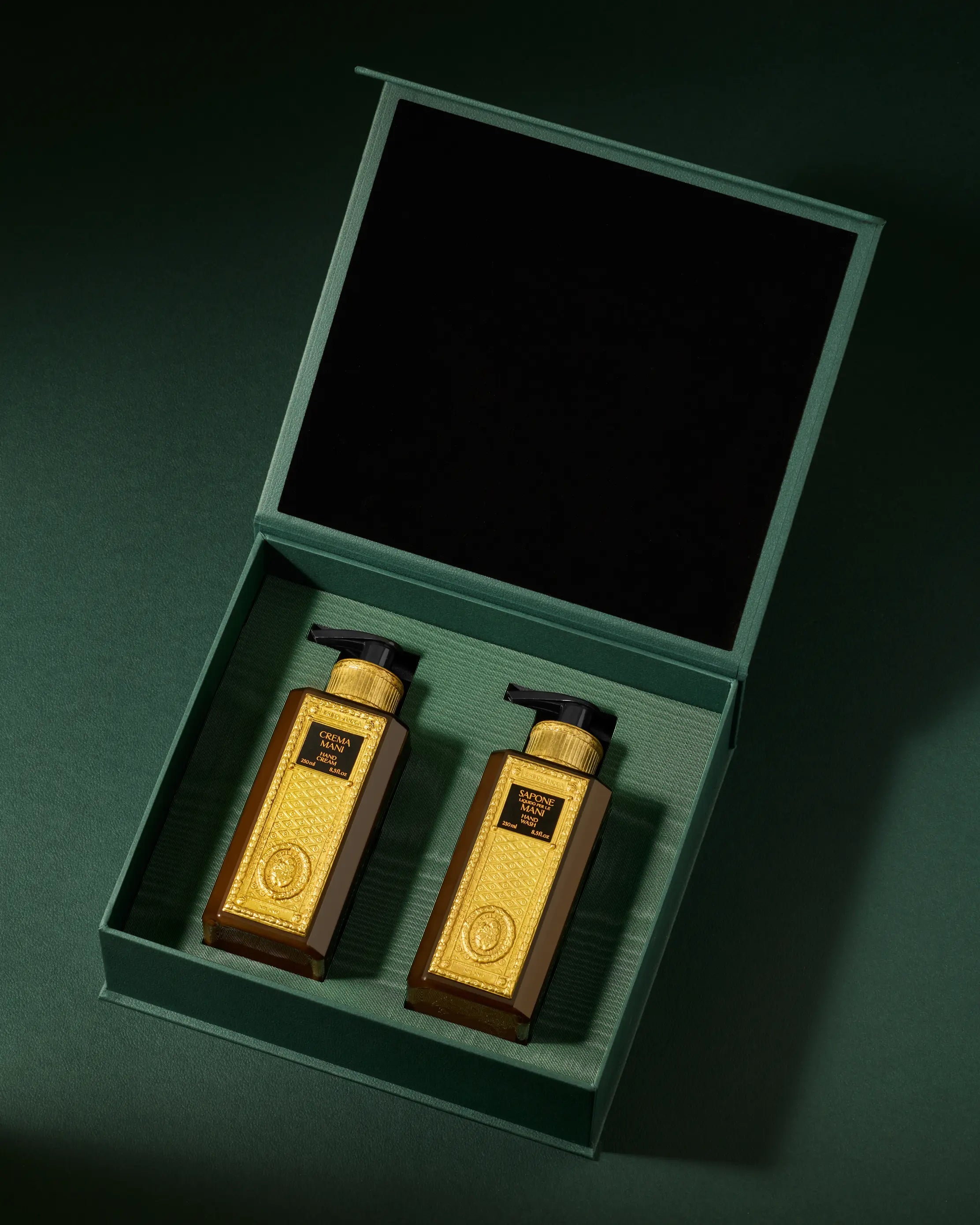 This elegant gift set is dedicated exclusively to the hands, replenishing the skin with renewed comfort and softness: a liquid soap and hand cream, presented together inside an exclusive box that speaks the aesthetic language of Eredi Zucca.