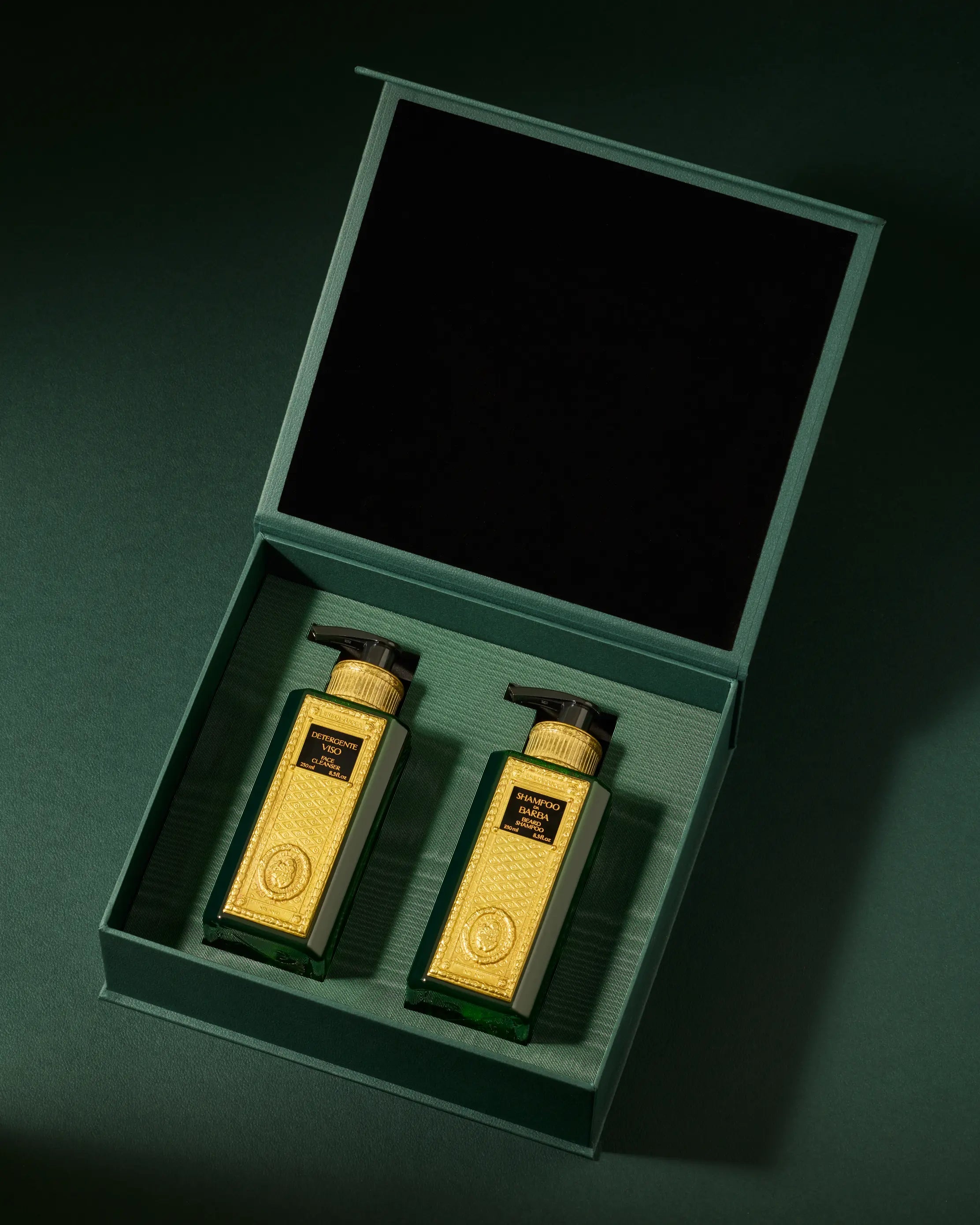A refined duo curated to refresh his cleansing routine, combining a face cleanser and beard shampoo that work together in perfect harmony. The box in which they are presented perfectly embodies the stylistic DNA of Eredi Zucca, opening to reveal two deep green bottles embellished with brass details in a balanced dialogue between artisanal tradition and modern sensitivity.