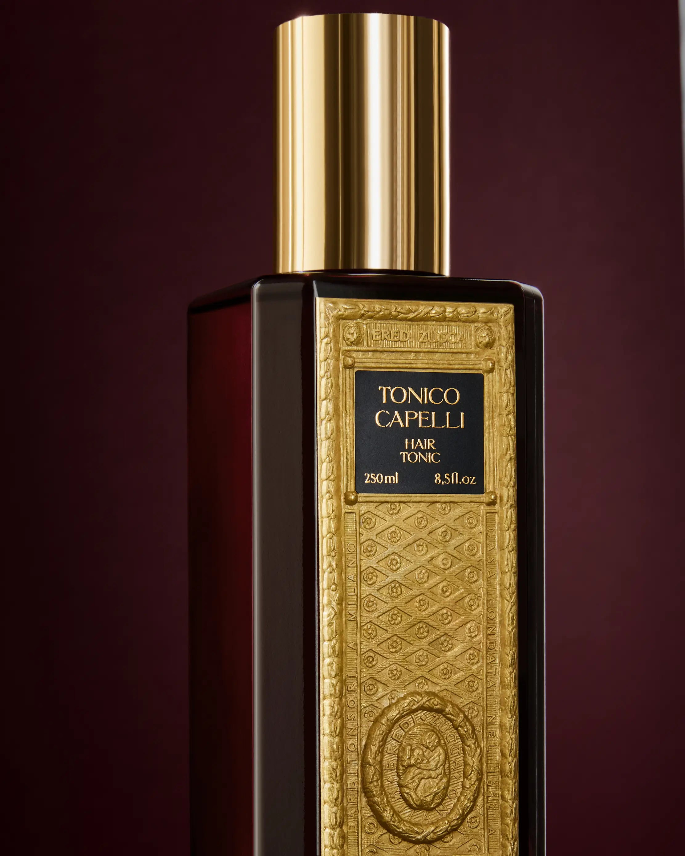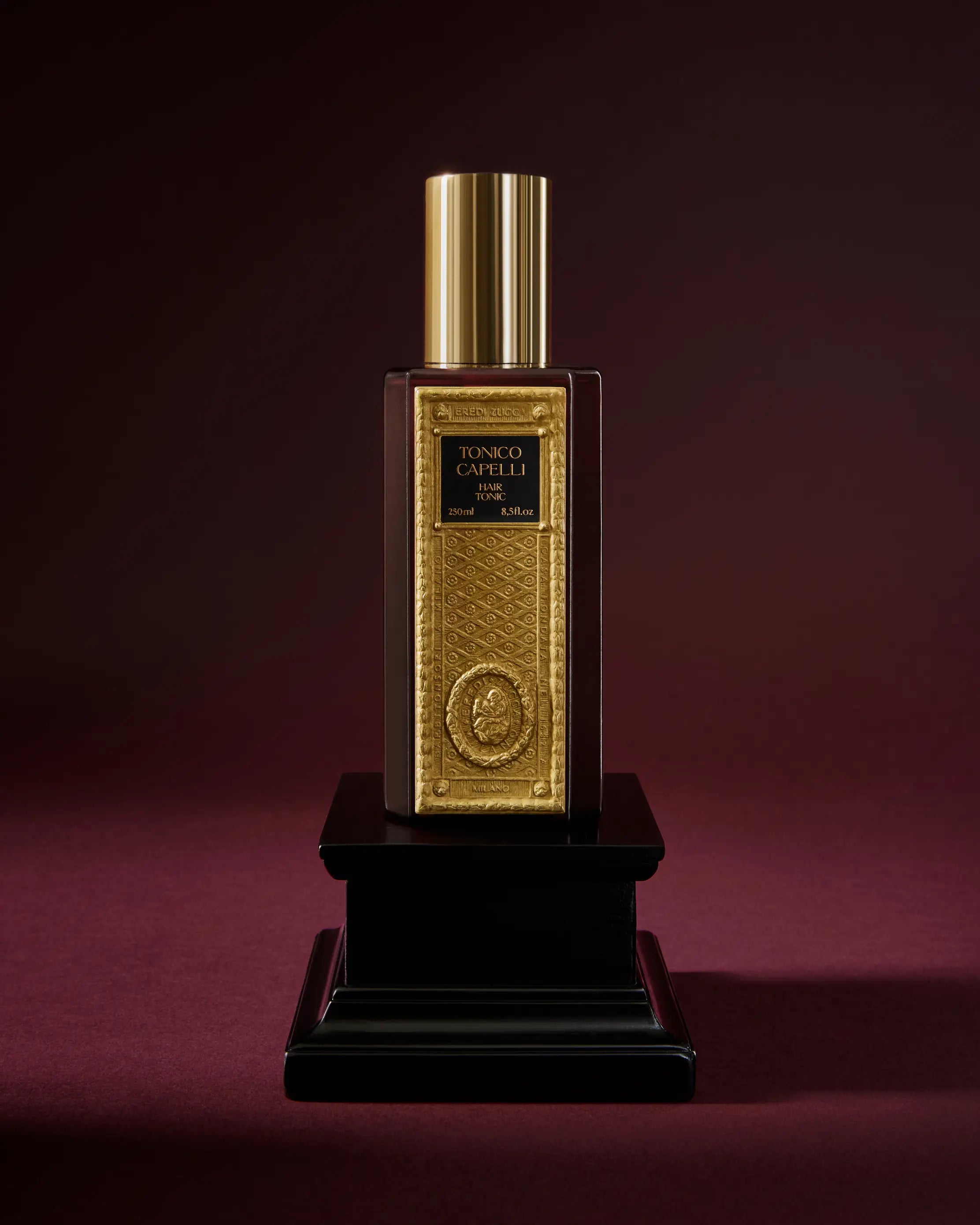 - Contained in a 250 ml burgundy PETG bottle, embellished with brass Eredi Zucca details