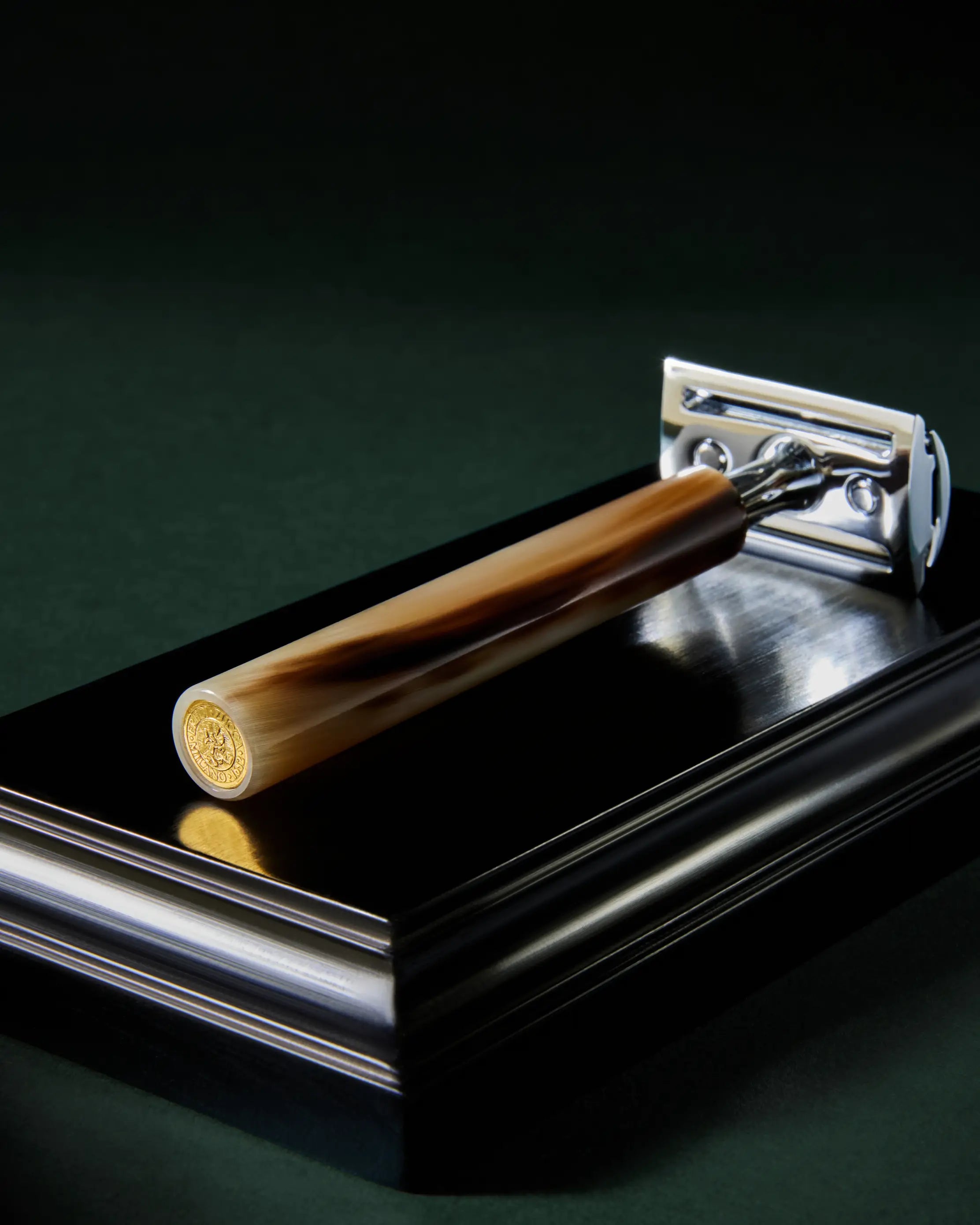 Razor with traditional safety head, luxurious ox horn handle and brass Eredi Zucca medallion.