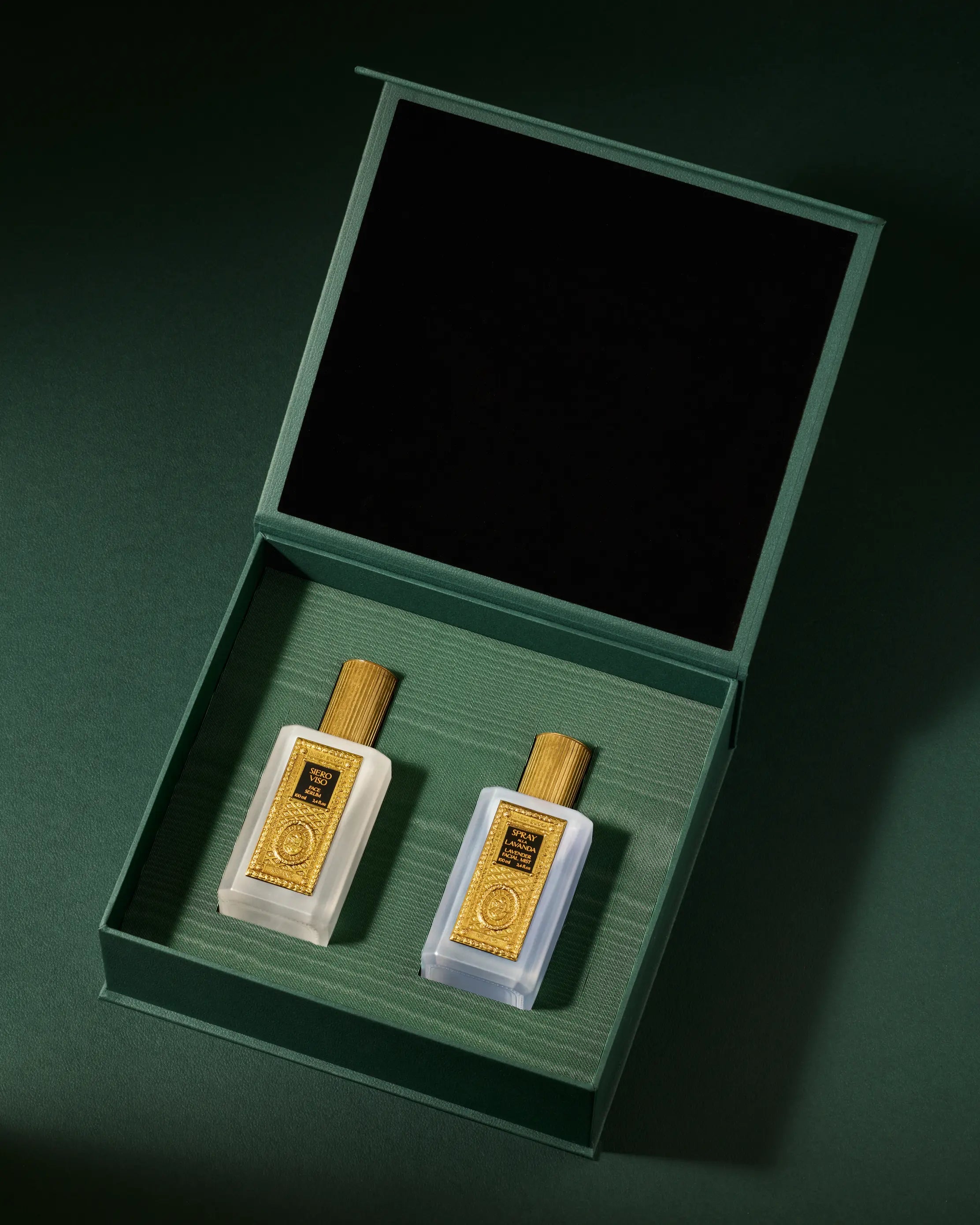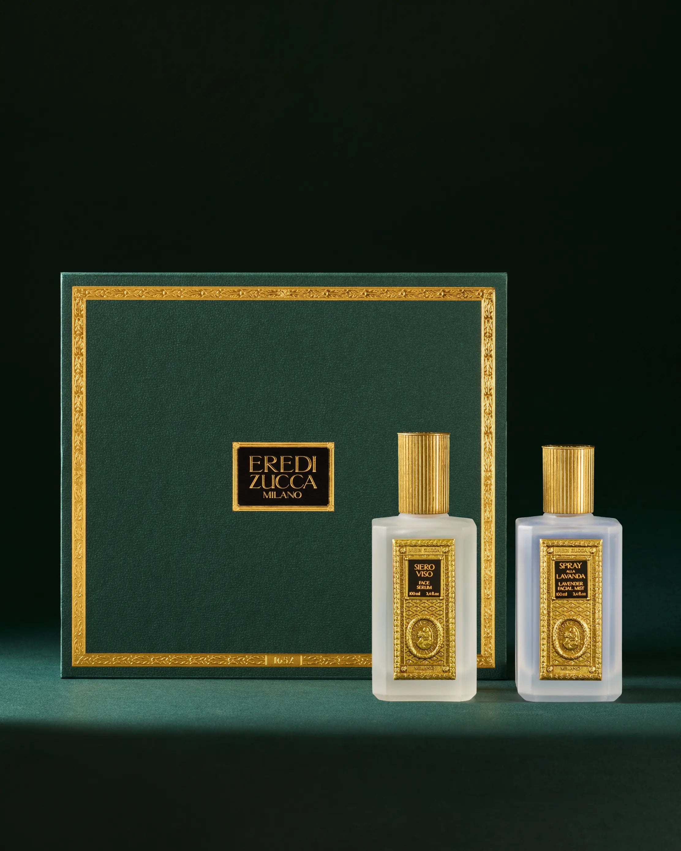 A refined face serum and lavender spray give rise to a complete ritual designed to protect, regenerate and revitalise the skin day after day. The box in which they are presented perfectly embodies the stylistic DNA of Eredi Zucca, opening to reveal two clear glass bottles embellished with brass details in a balanced dialogue between artisanal tradition and modern sensitivity.