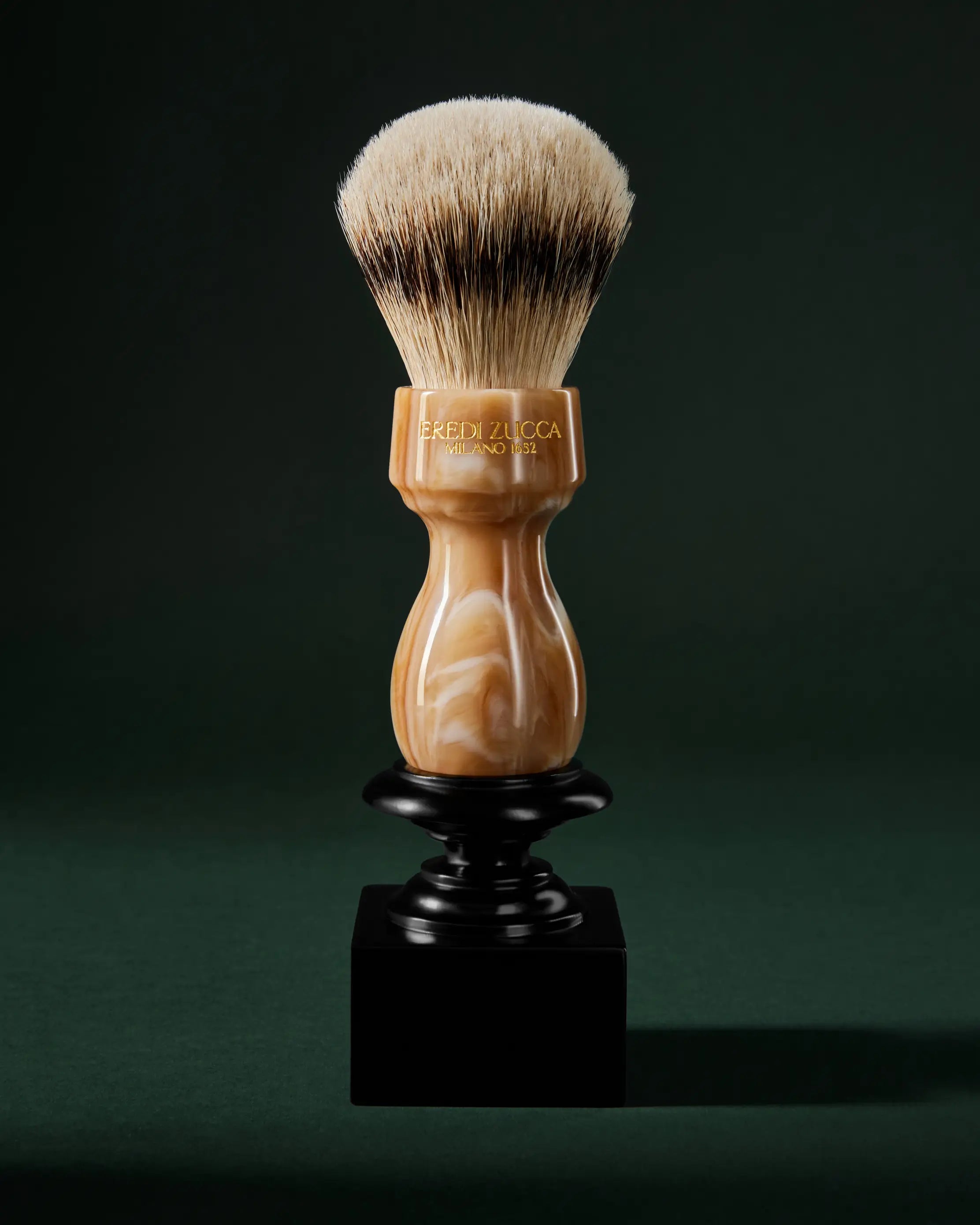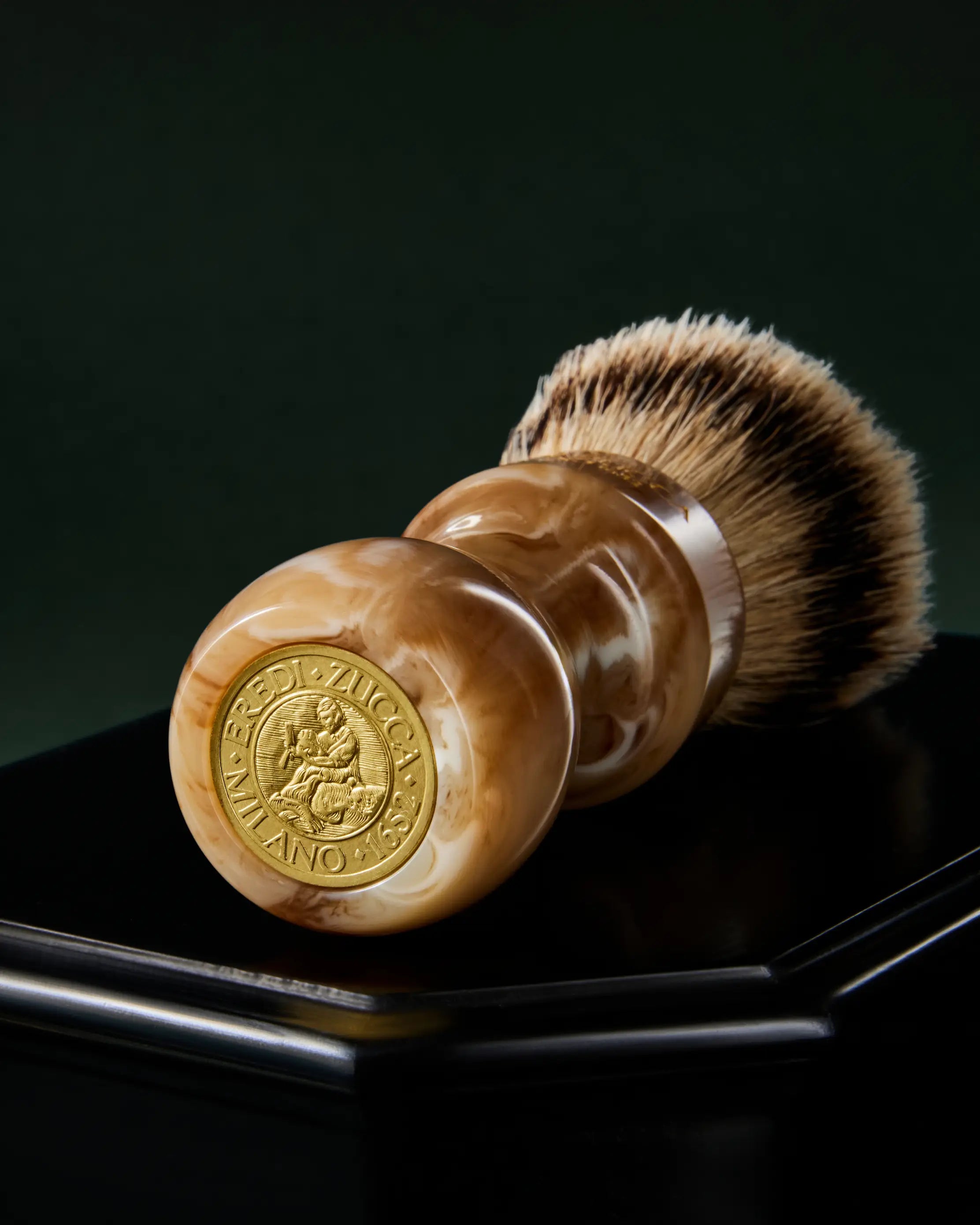 This accessory has been crafted with exceptional care for both materials and details, using the most prestigious of techniques that define the art of Italian craftsmanship. Characterised by refined marble-effect veining, its resin handle boasts a harmonious silhouette and a brass Eredi Zucca medallion on the base. A comfortable grip and soft badger bristles make this professional brush a high-precision, robust and effortlessly functional tool.