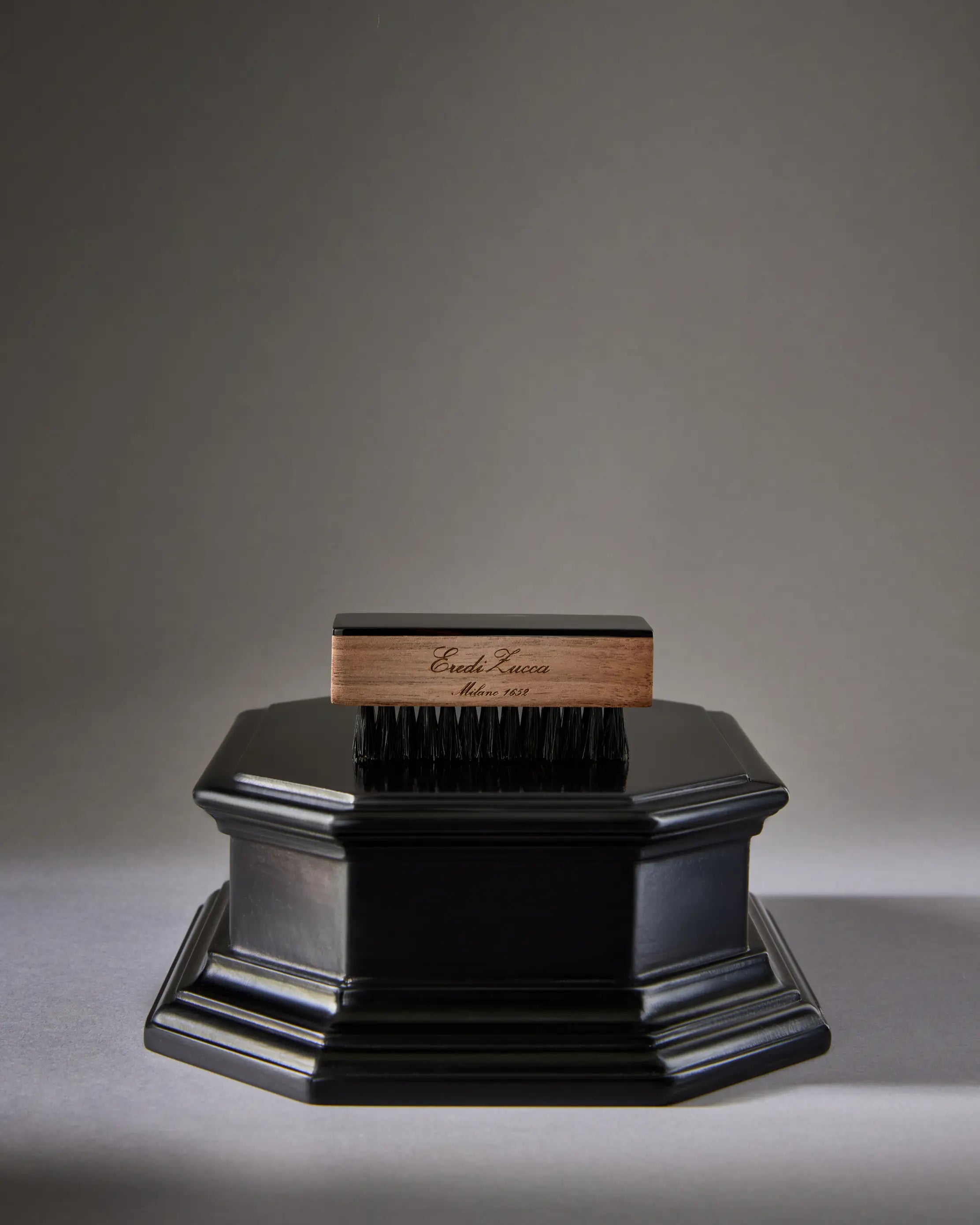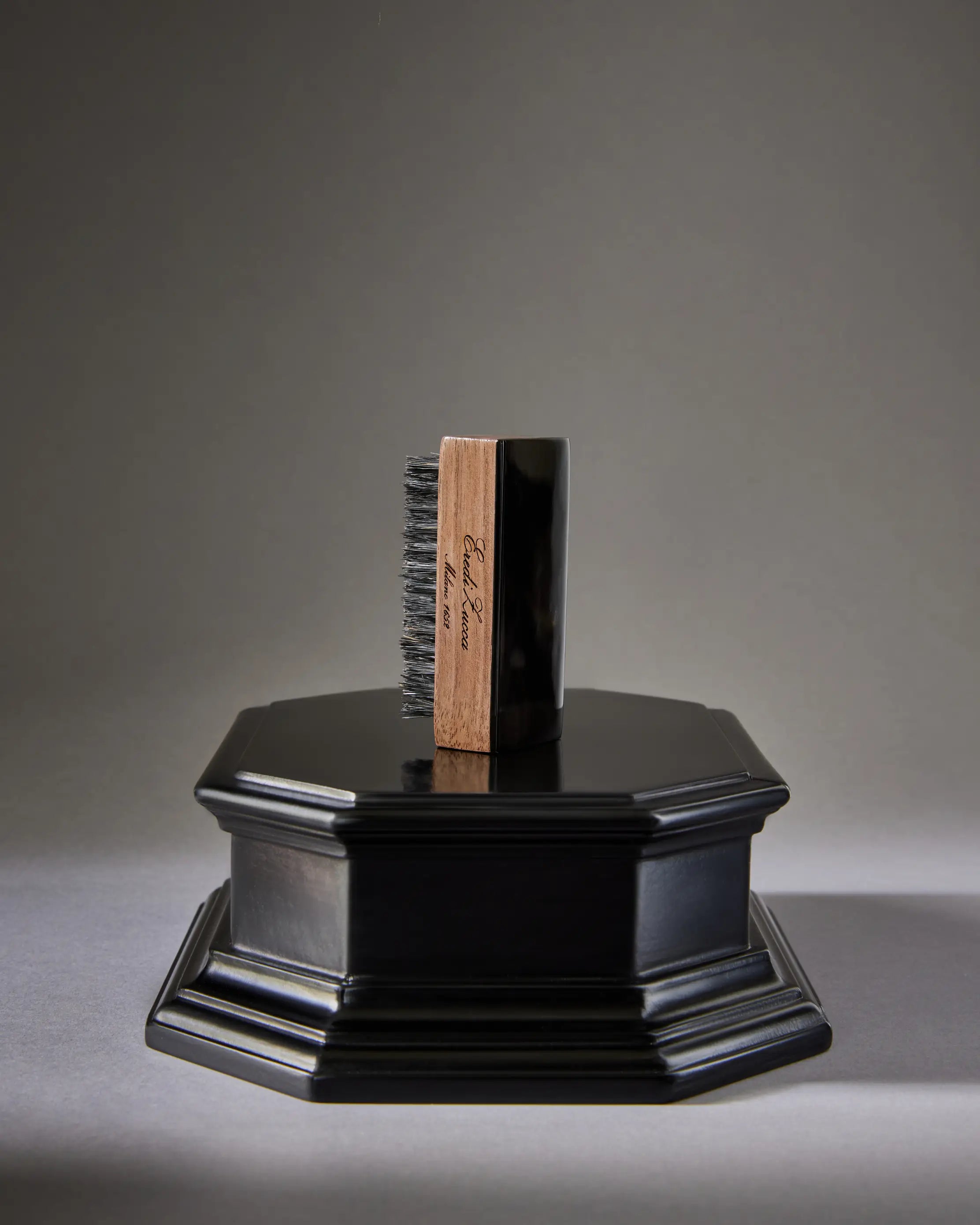 The unparalleled prestige of traditional Italian craftsmanship in each and every detail: from a naturally beautiful walnut base, sculpted by the hands of expert Italian artisans, to a hand-crafted dark ox horn plaque, adding a rustic yet refined touch. Elevated with soft boar bristles, masterfully arranged to massage the nails and stimulate circulation of the skin.