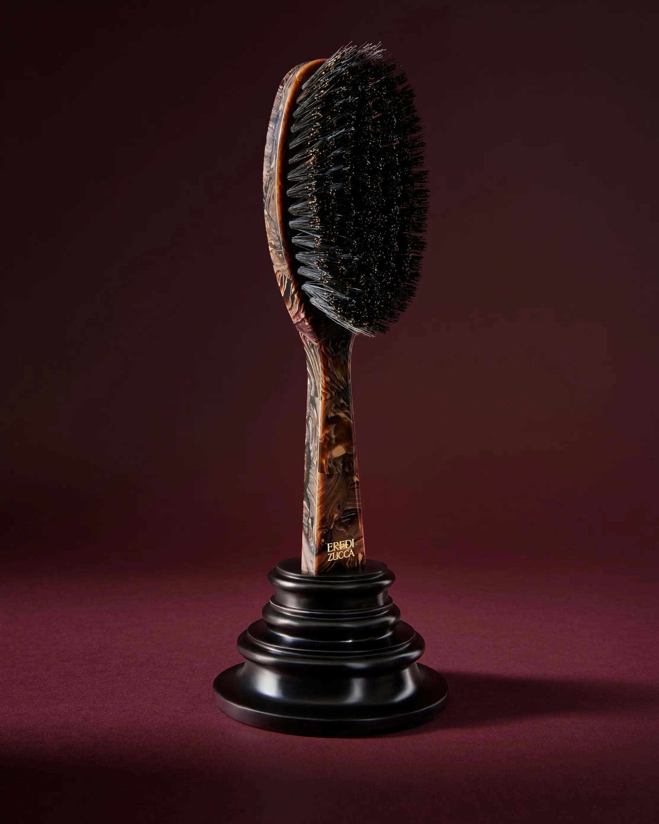 This elegant hairbrush's Chocolate Carrara acetate handle has been crafted by the hands of our expert Italian artisans. Combining anti-static properties with a refined aesthetic embellished with a gold Eredi Zucca logo, it features boar bristles that gently massage the skin to stimulate circulation and strengthen the roots.