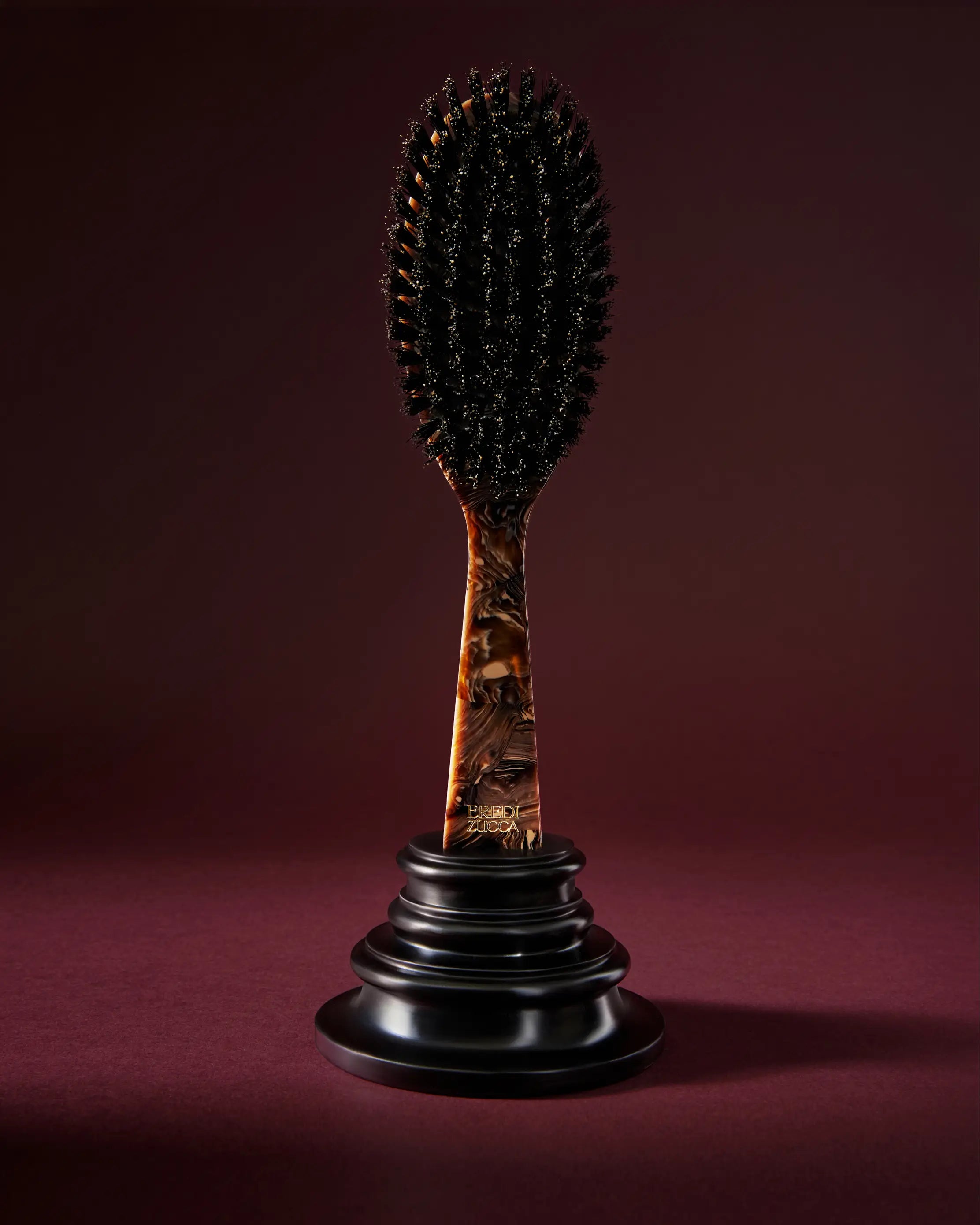 Oval hairbrush with natural boar bristles and Chocolate Carrara acetate handle.