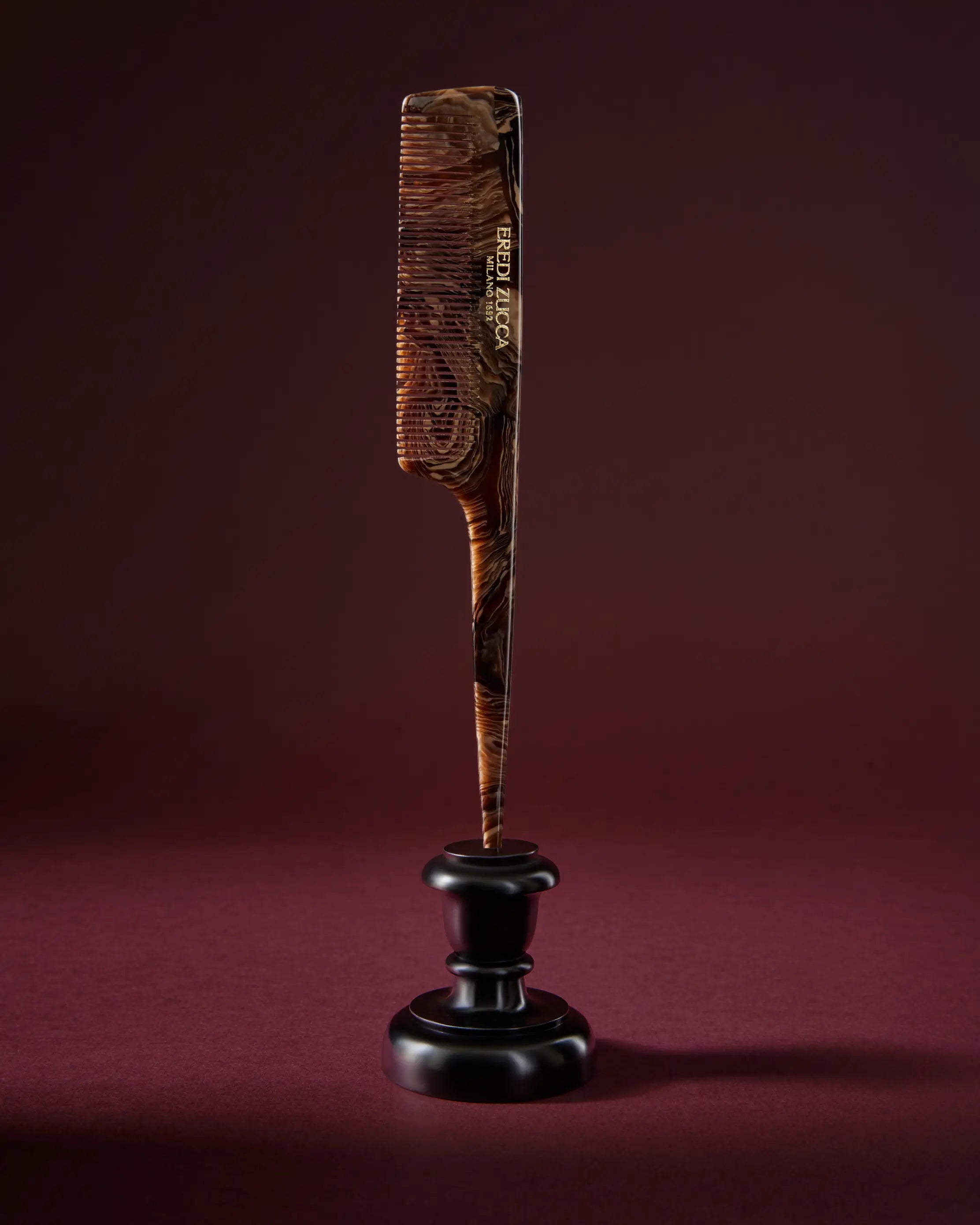Elegant, practical and truly unique. Hand-crafted from Chocolate Carrara acetate, inspired by Eredi Zucca’s signature marble, this fine-tooth comb is designed to untangle hairs delicately and with precision. Sturdy yet lightweight with an iconic pin-tail silhouette: perfect for anyone who demands only the best from their everyday hair care.