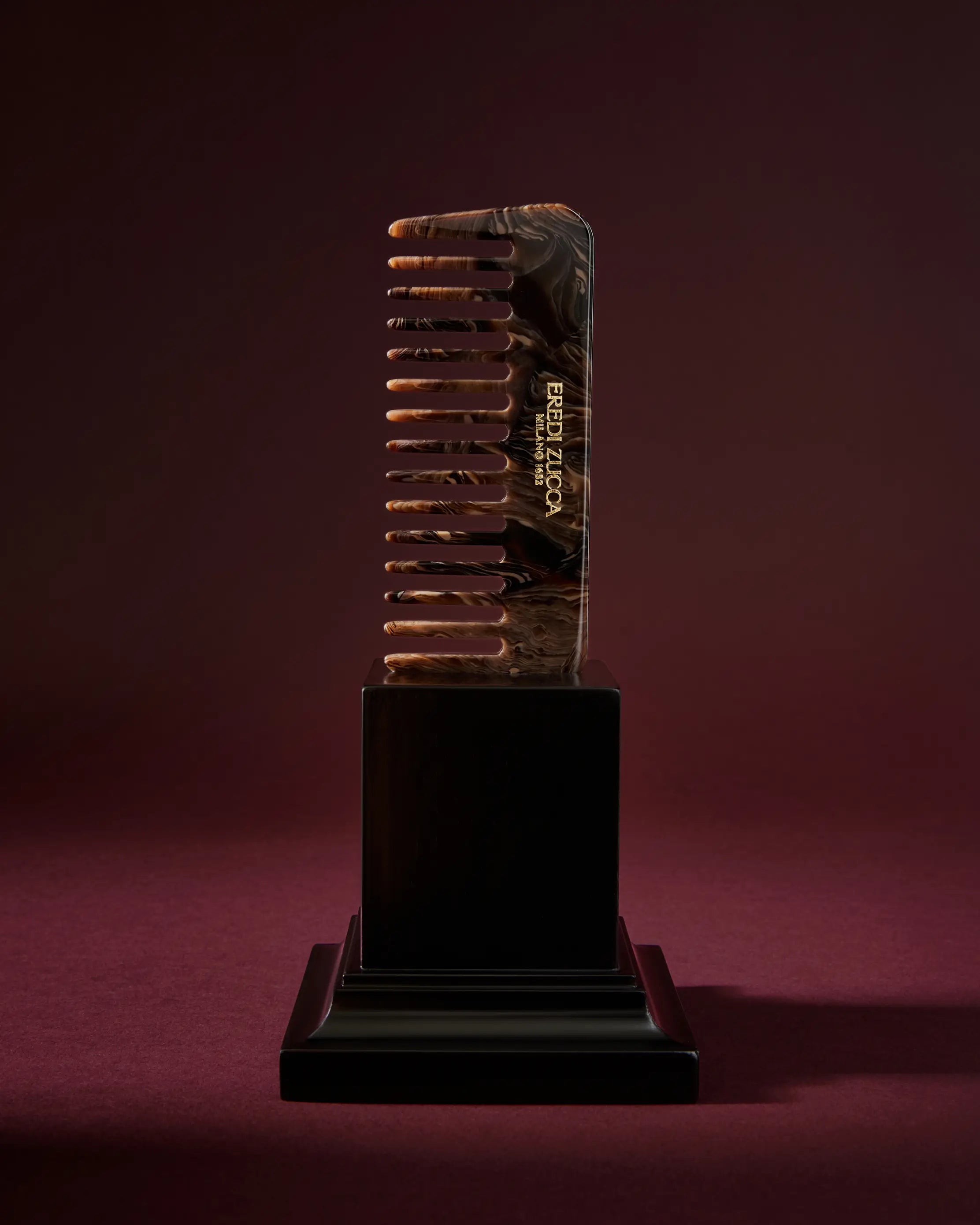 Elegant, practical and truly unique. Hand-crafted from Chocolate Carrara acetate, inspired by Eredi Zucca’s signature marble, this wide-tooth comb is designed to manage and separate even the thickest, most unruly of locks. Durable, compact and lightweight at once: perfect for flawless grooming on the go.
