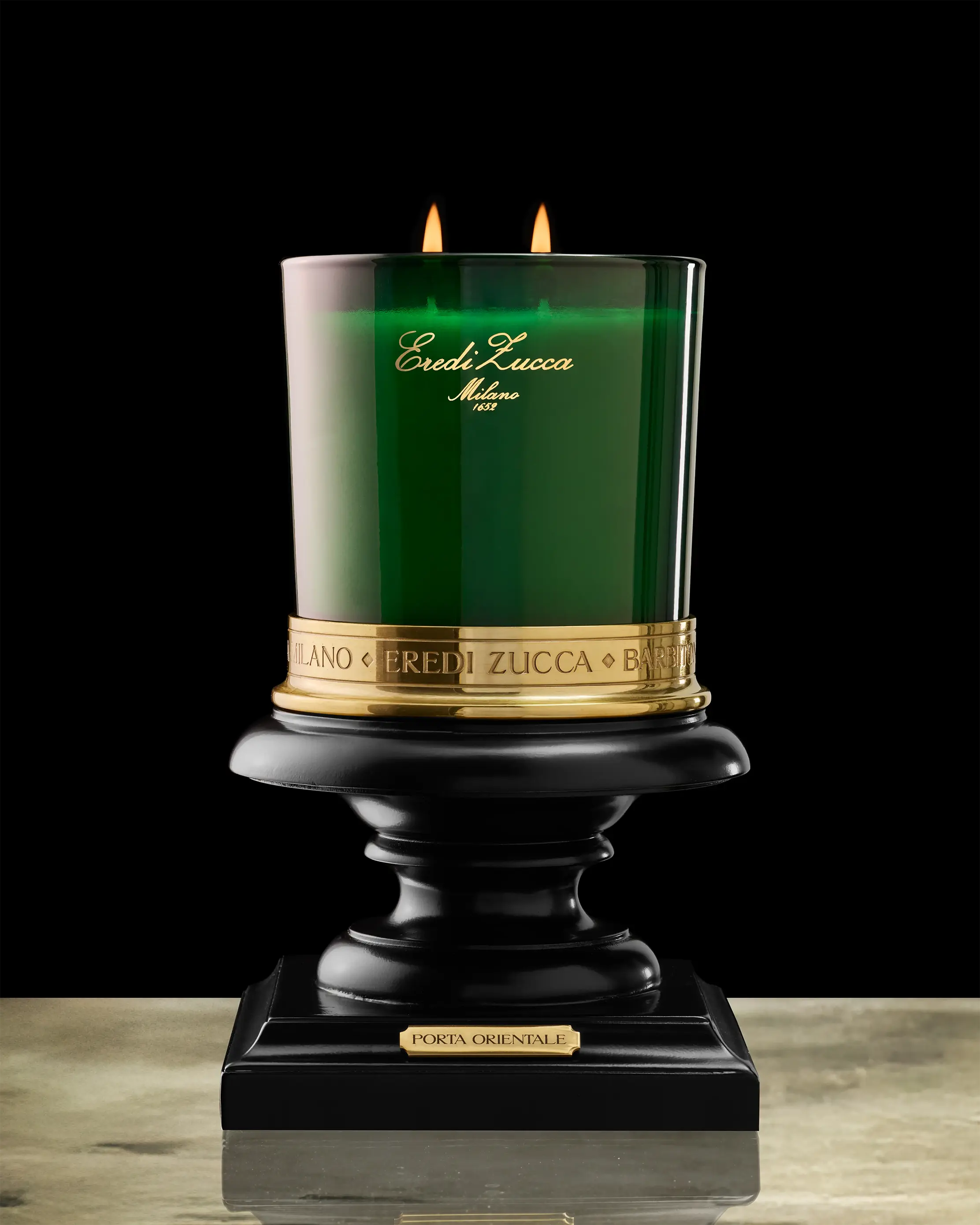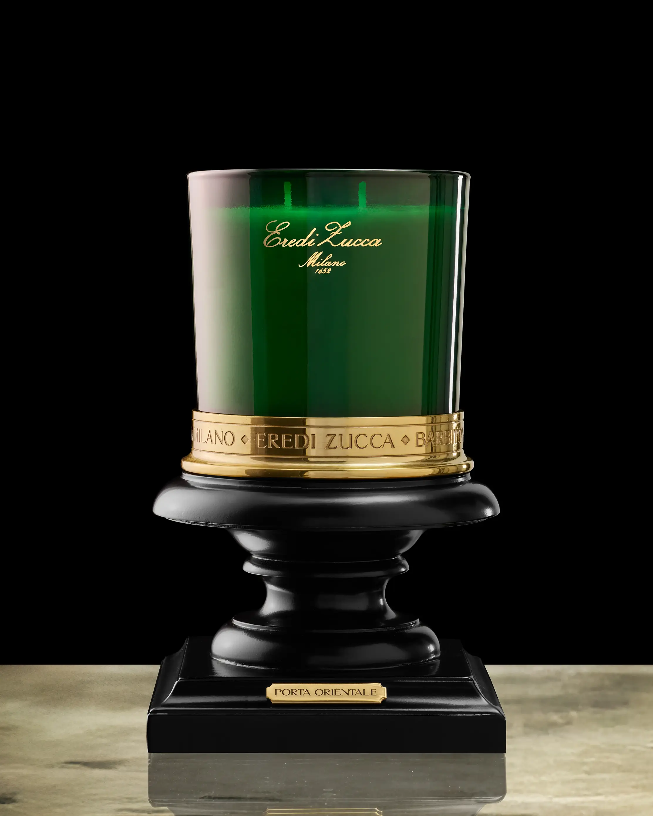 A fresh, botanical fragrance with modern character. The Porta Orientale scented candle opens with Italian lemon and eucalyptus, breathing a shimmering, natural clarity. Fig leaves soften its contours, complemented by the bright, spiced lift of fresh ginger. A heart of spearmint and fig milk amplifies its verdant allure, enriched with the succulent notes of blackcurrant. Refining the accord are delicate notes of jasmine, melting into a creamy, soft vanilla-musk base. The impression it leaves is radiant, refined, and quietly contemporary.