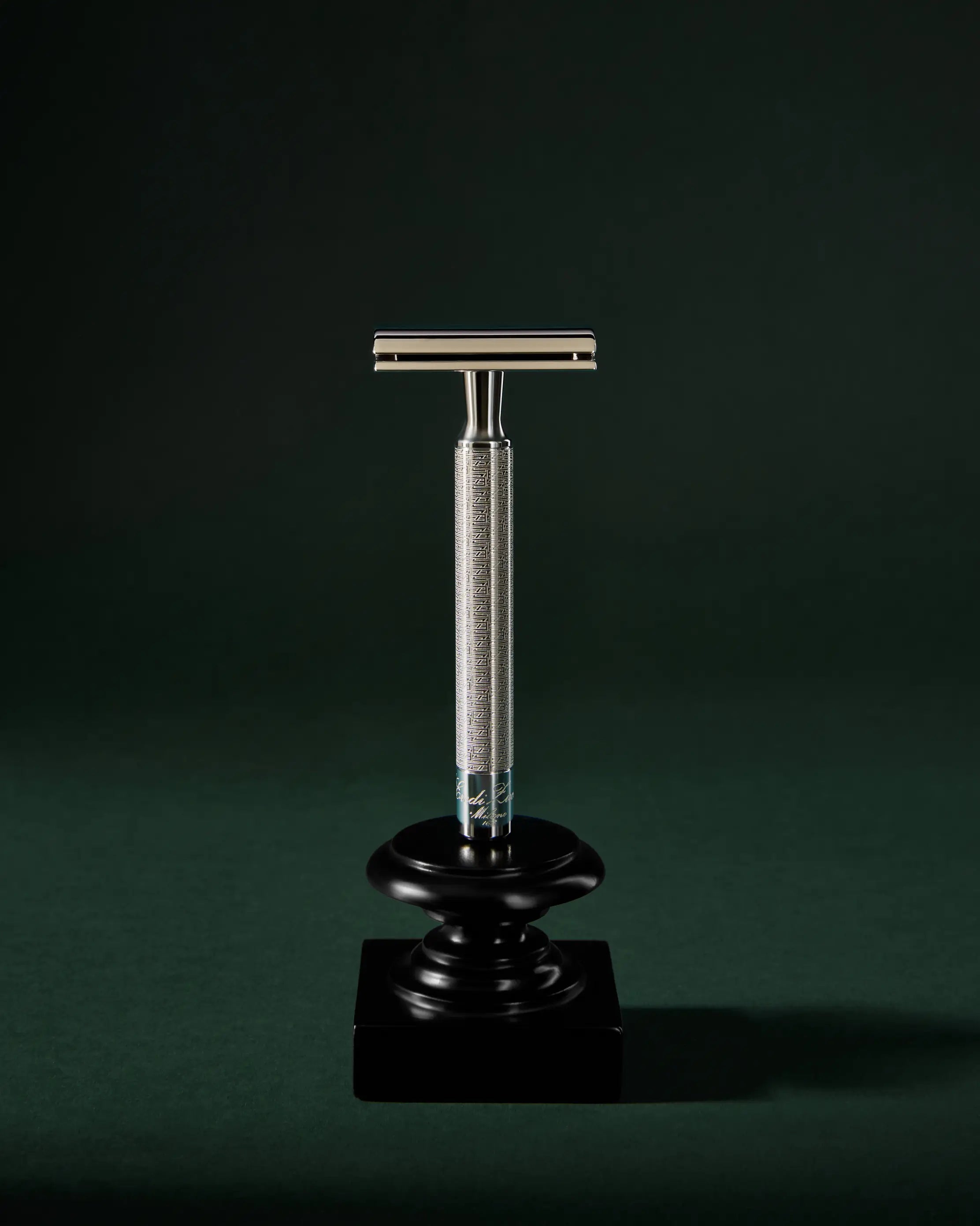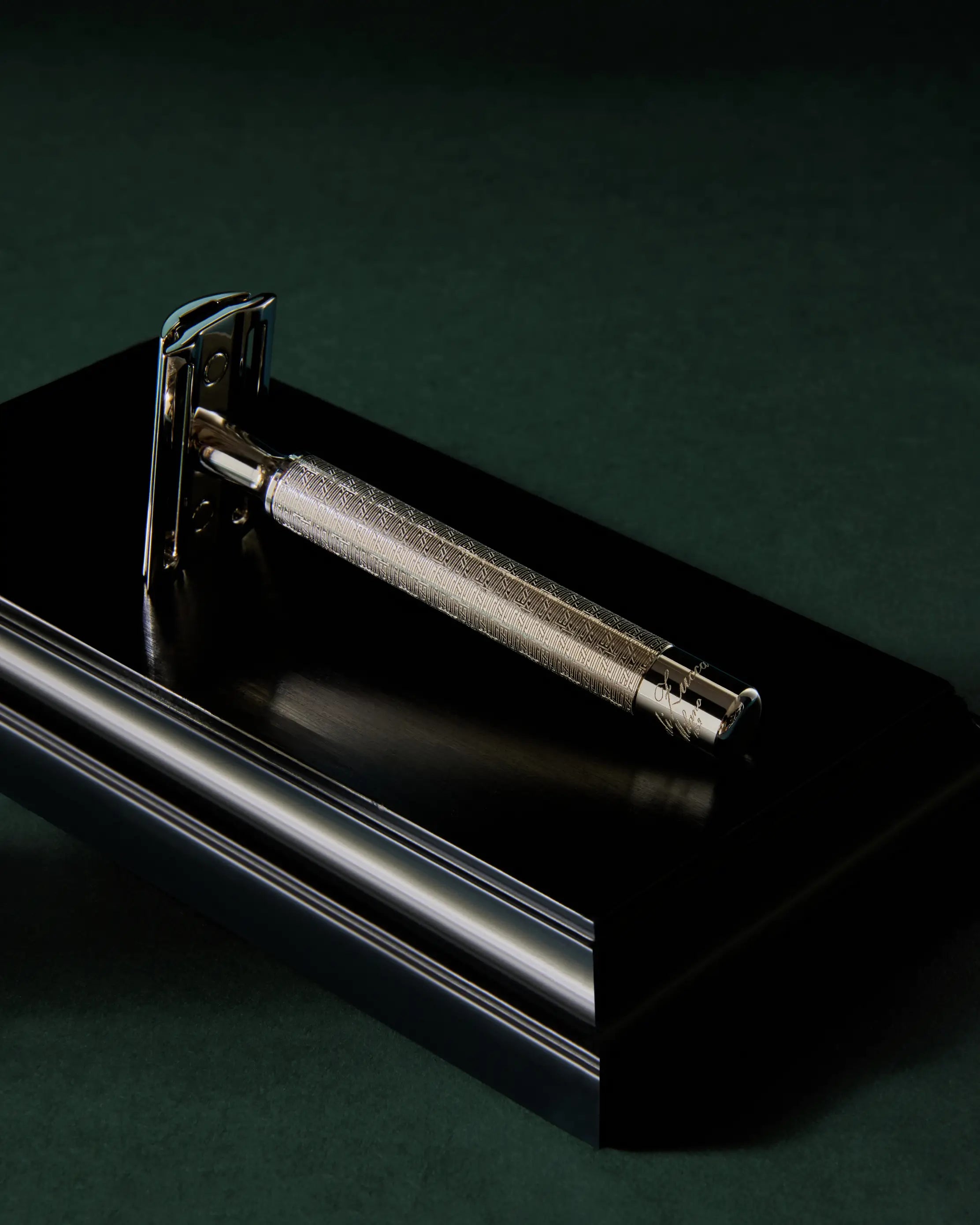 Distinguished by a sophisticated Eredi Zucca monogram motif engraved on the handle, this safety razor is an elegant yet timeless tool, perfect for anyone dipping their toes into the world of traditional shaving for the first time. Both the zamak upper plate and comb head and brass handle are elevated with a platinum-plated chrome finish, protecting the razor from corrosion and distributing its weight evenly for enhanced comfort: an exceptional design with meticulous attention to detail.